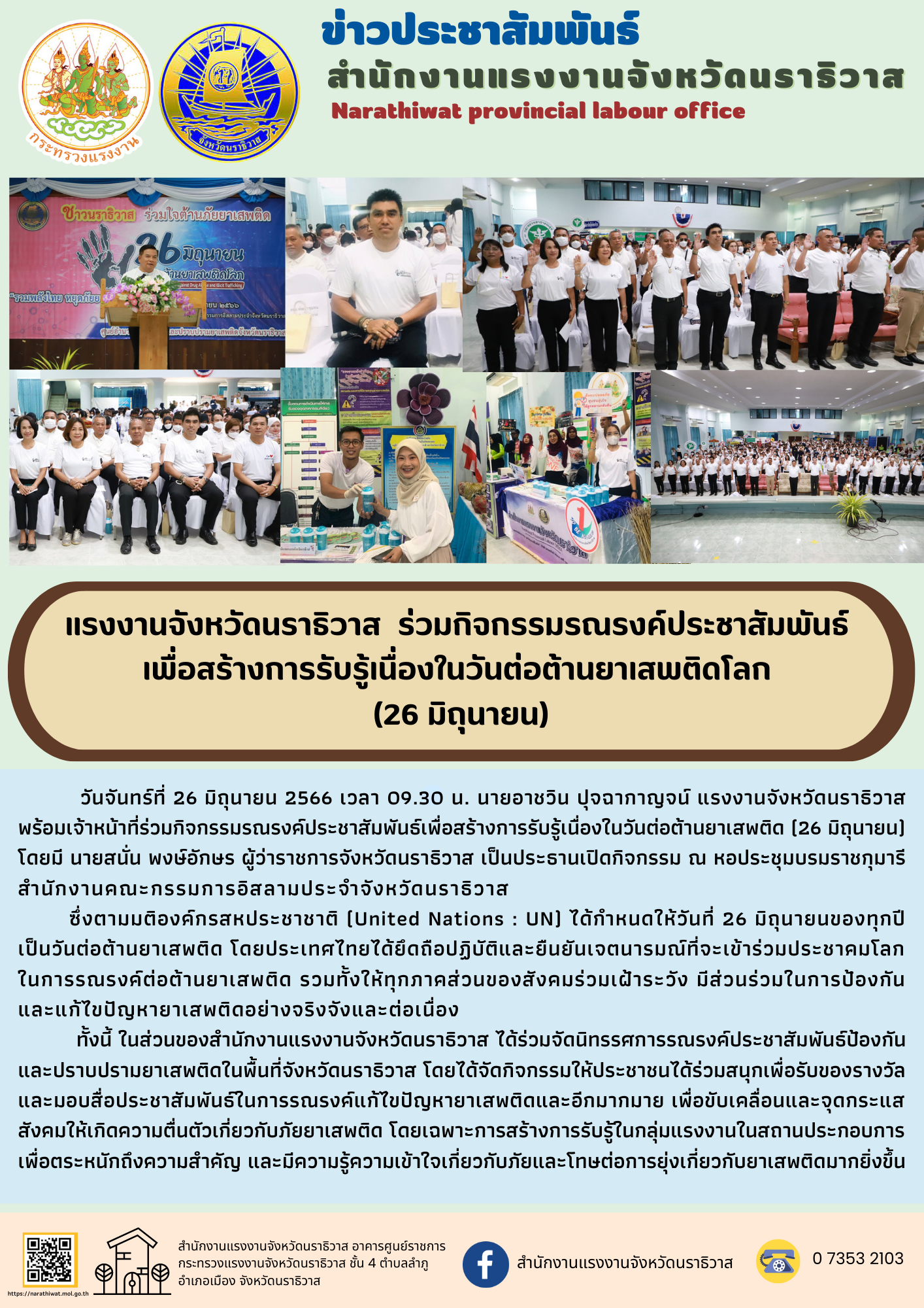 วันจันทร์ที่ 26 มิถุนายน 2566 เวลา 09.30 น. นายอาชวิน ปุจฉากาญจน์ แรงงานจังหวัดนราธิวาส พร้อมเจ้าหน้าที่ร่วมกิจกรรมรณรงค์ประชาสัมพันธ์เพื่อสร้างการรับรู้เนื่องในวันต่อต้านยาเสพติด (26 มิถุนายน) โดยมี นายสนั่น พงษ์อักษร ผู้ว่าราชการจังหวัดนราธิวาส เป็นประธานเปิดกิจกรรม ณ หอประชุมบรมราชกุมารีสำนักงานคณะกรรมการอิสลามประจำจังหวัดนราธิวาส ซึ่งตามมติองค์กรสหประชาชาติ (United Nations : UN) ได้กำหนดให้วันที่ 26 มิถุนายนของทุกปีเป็นวันต่อต้านยาเสพติด โดยประเทศไทยได้ยึดถือปฏิบัติและยืนยันเจตนารมณ์ที่จะเข้าร่วมประชาคมโลกในการรณรงค์ต่อต้านยาเสพติด รวมทั้งให้ทุกภาคส่วนของสังคมร่วมเฝ้าระวัง มีส่วนร่วมในการป้องกันและแก้ไขปัญหายาเสพติดอย่างจริงจังและต่อเนื่อง ทั้งนี้ ในส่วนของสำนักงานแรงงานจังหวัดนราธิวาส ได้ร่วมจัดนิทรรศการรณรงค์ประชาสัมพันธ์ป้องกันและปราบปรามยาเสพติดในพื้นที่จังหวัดนราธิวาส โดยได้จัดกิจกรรมให้ประชาชนได้ร่วมสนุกเพื่อรับของรางวัลและมอบสื่อประชาสัมพันธ์ในการรณรงค์แก้ไขปัญหายาเสพติดและอีกมากมาย เพื่อขับเคลื่อนและจุดกระแสสังคมให้เกิดความตื่นตัวเกี่ยวกับภัยยาเสพติด โดยเฉพาะการสร้างการรับรู้ในกลุ่มแรงงานในสถานประกอบการเพื่อตระหนักถึงความสำคัญ และมีความรู้ความเข้าใจเกี่ยวกับภัยและโทษต่อการยุ่งเกี่ยวกับยาเสพติดมากยิ่งขึ้น