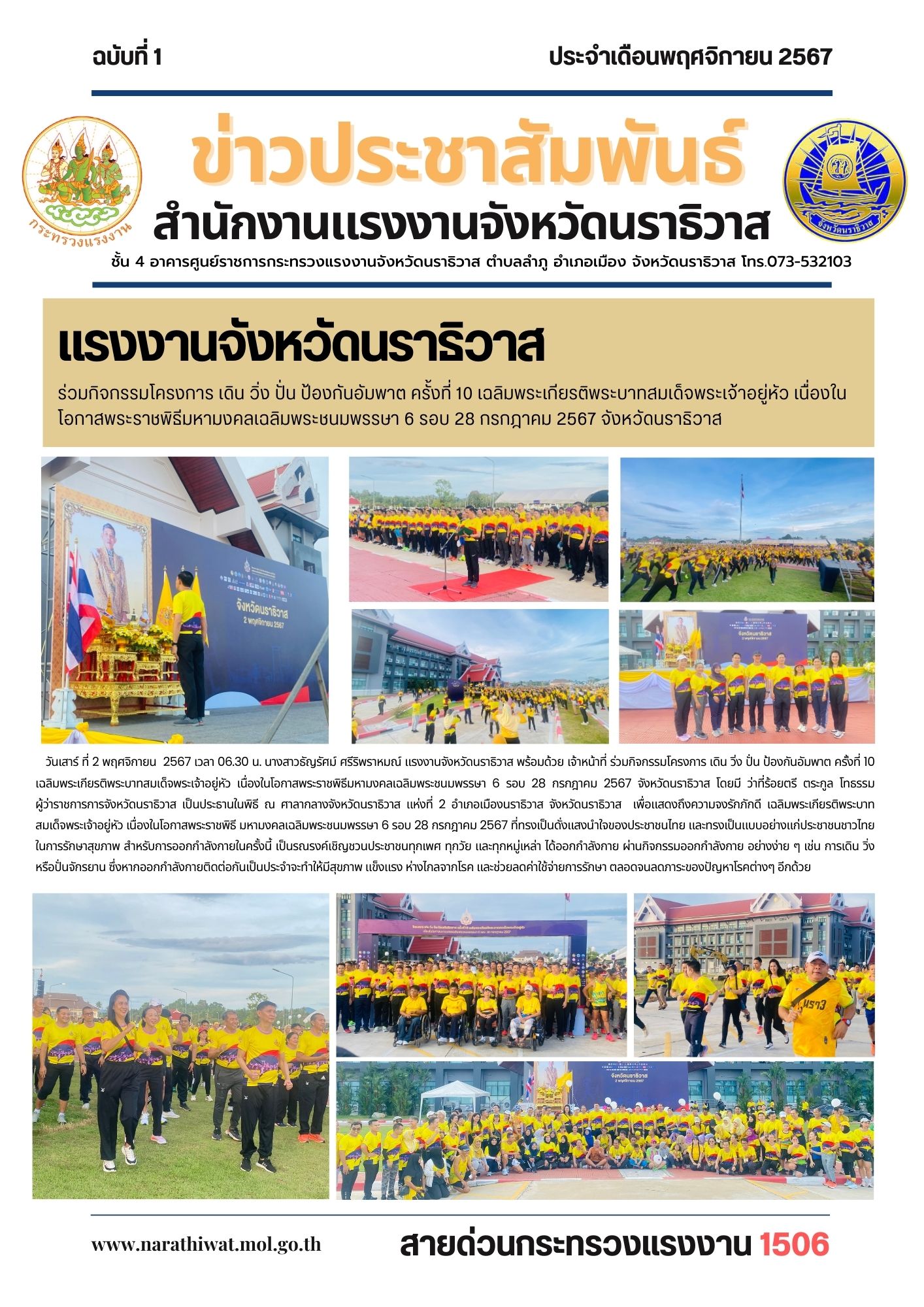 วันเสาร์ ที่ 2 พฤศจิกายน 2567 เวลา 06.30 น. นางสาวธัญรัศม์ ศรีริพราหมณ์ แรงงานจังหวัดนราธิวาส พร้อมด้วย เจ้าหน้าที่ ร่วมกิจกรรมโครงการ เดิน วิ่ง ปั่น ป้องกันอัมพาต ครั้งที่ 10 เฉลิมพระเกียรติพระบาทสมเด็จพระเจ้าอยู่หัว เนื่องในโอกาสพระราชพิธีมหามงคลเฉลิมพระชนมพรรษา 6 รอบ 28 กรกฎาคม 2567 จังหวัดนราธิวาส โดยมี ว่าที่ร้อยตรี ตระกูล โทธรรม ผู้ว่าราชการการจังหวัดนราธิวาส เป็นประธานในพิธี ณ ศาลากลางจังหวัดนราธิวาส แห่งที่ 2 อำเภอเมืองนราธิวาส จังหวัดนราธิวาส เพื่อแสดงถึงความจงรักภักดี เฉลิมพระเกียรติพระบาทสมเด็จพระเจ้าอยู่หัว เนื่องในโอกาสพระราชพิธี มหามงคลเฉลิมพระชนมพรรษา 6 รอบ 28 กรกฎาคม 2567 ที่ทรงเป็นดั่งแสงนำใจของประชาชนไทย และทรงเป็นแบบอย่างแก่ประชาชนชาวไทยในการรักษาสุขภาพ สำหรับการออกกำลังกายในครั้งนี้ เป็นรณรงค์เชิญชวนประชาชนทุกเพศ ทุกวัย และทุกหมู่เหล่า ได้ออกกำลังกาย ผ่านกิจกรรมออกกำลังกาย อย่างง่าย ๆ เช่น การเดิน วิ่ง หรือปั่นจักรยาน ซึ่งหากออกกำลังกายติดต่อกันเป็นประจำจะทำให้มีสุขภาพ แข็งแรง ห่างไกลจากโรค และช่วยลดค่าใช้จ่ายการรักษา ตลอดจนลดภาระของปัญหาโรคต่างๆ อีกด้วย