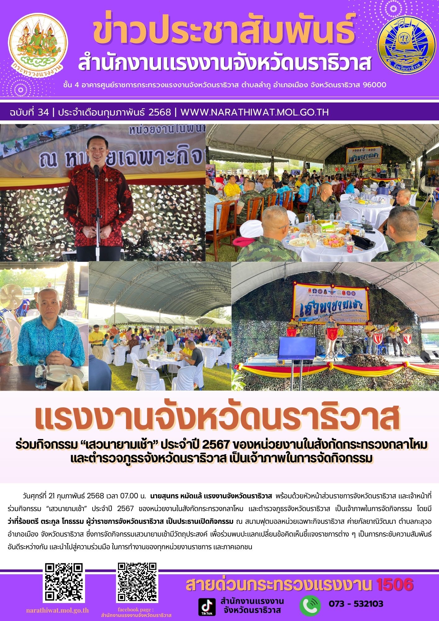 วันศุกร์ที่ 21 กุมภาพันธ์ 2568 เวลา 07.00 น. นายสุนทร หมัดแล้ แรงงานจังหวัดนราธิวาส พร้อมด้วยหัวหน้าส่วนราชการจังหวัดนราธิวาส และเจ้าหน้าที่ ร่วมกิจกรรม “เสวนายามเช้า” ประจำปี 2567 ของหน่วยงานในสังกัดกระทรวงกลาโหม และตำรวจภูธรจังหวัดนราธิวาส เป็นเจ้าภาพในการจัดกิจกรรม โดยมี ว่าที่ร้อยตรี ตระกูล โทธรรม ผู้ว่าราชการจังหวัดนราธิวาส เป็นประธานเปิดกิจกรรม ณ สนามฟุตบอลหน่วยเฉพาะกิจนราธิวาส ค่ายกัลยาณิวัฒนา ตำบลกะลุวอ อำเภอเมือง จังหวัดนราธิวาส ซึ่งการจัดกิจกรรมเสวนายามเช้ามีวัตถุประสงค์ เพื่อร่วมพบปะแลกเปลี่ยนข้อคิดเห็นชี้แจงราชการต่าง ๆ เป็นการกระชับความสัมพันธ์อันดีระหว่างกัน และนำไปสู่ความร่วมมือ ในการทำงานของทุกหน่วยงานราชการ และภาคเอกชน