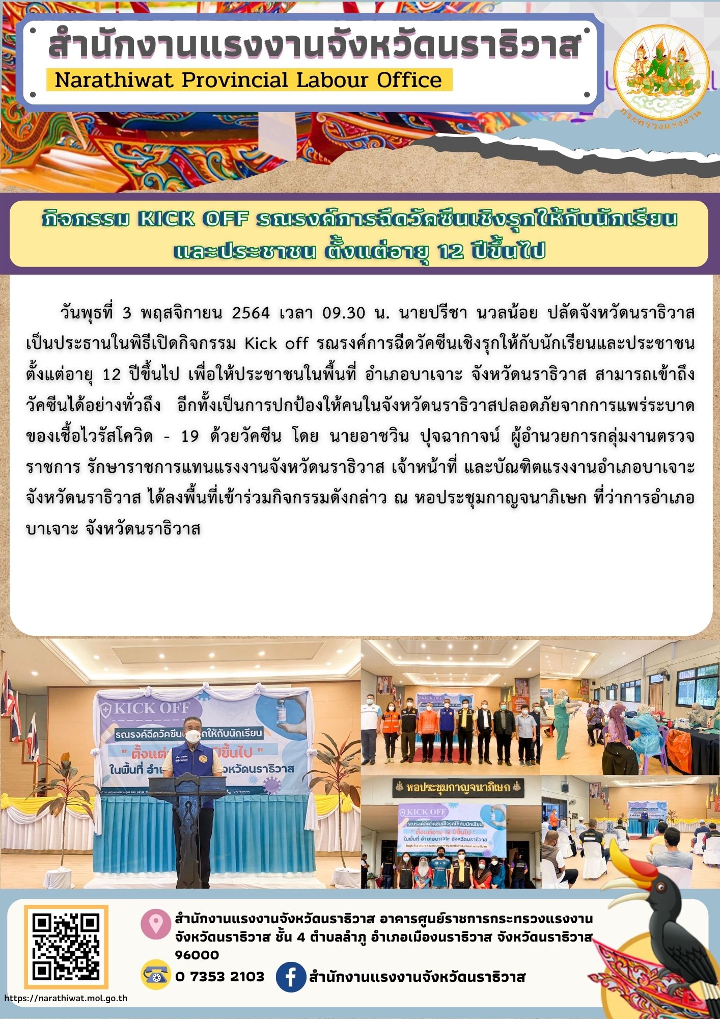 วันพุธที่ 3 พฤสจิกายน 2564 เวลา 09.30 น. นายปรีชา นวลน้อย ปลัดจังหวัดนราธิวาส เป็นประธานในพิธีเปิดกิจกรรม Kick off รณรงค์การฉีดวัคซีนเชิงรุกให้กับนักเรียนและประชาชน ตั้งแต่อายุ 12 ปีขึ้นไป เพื่อให้ประชาชนในพื้นที่ อำเภอบาเจาะ จังหวัดนราธิวาส สามารถเข้าถึงวัคซีนได้อย่างทั่วถึง อีกทั้งเป็นการปกป้องให้คนในจังหวัดนราธิวาสปลอดภัยจากการแพร่ระบาดของเชื้อไวรัสโควิด – 19 ด้วยวัคซีน โดย นายอาชวิน ปุจฉากาจน์ ผู้อำนวยการกลุ่มงานตรวจราชการ รักษาราชการแทนแรงงานจังหวัดนราธิวาส เจ้าหน้าที่ และบัณฑิตแรงงานอำเภอบาเจาะ จังหวัดนราธิวาส ได้ลงพื้นที่เข้าร่วมกิจกรรมดังกล่าว ณ หอประชุมกาญจนาภิเษก ที่ว่าการอำเภอบาเจาะ จังหวัดนราธิวาส