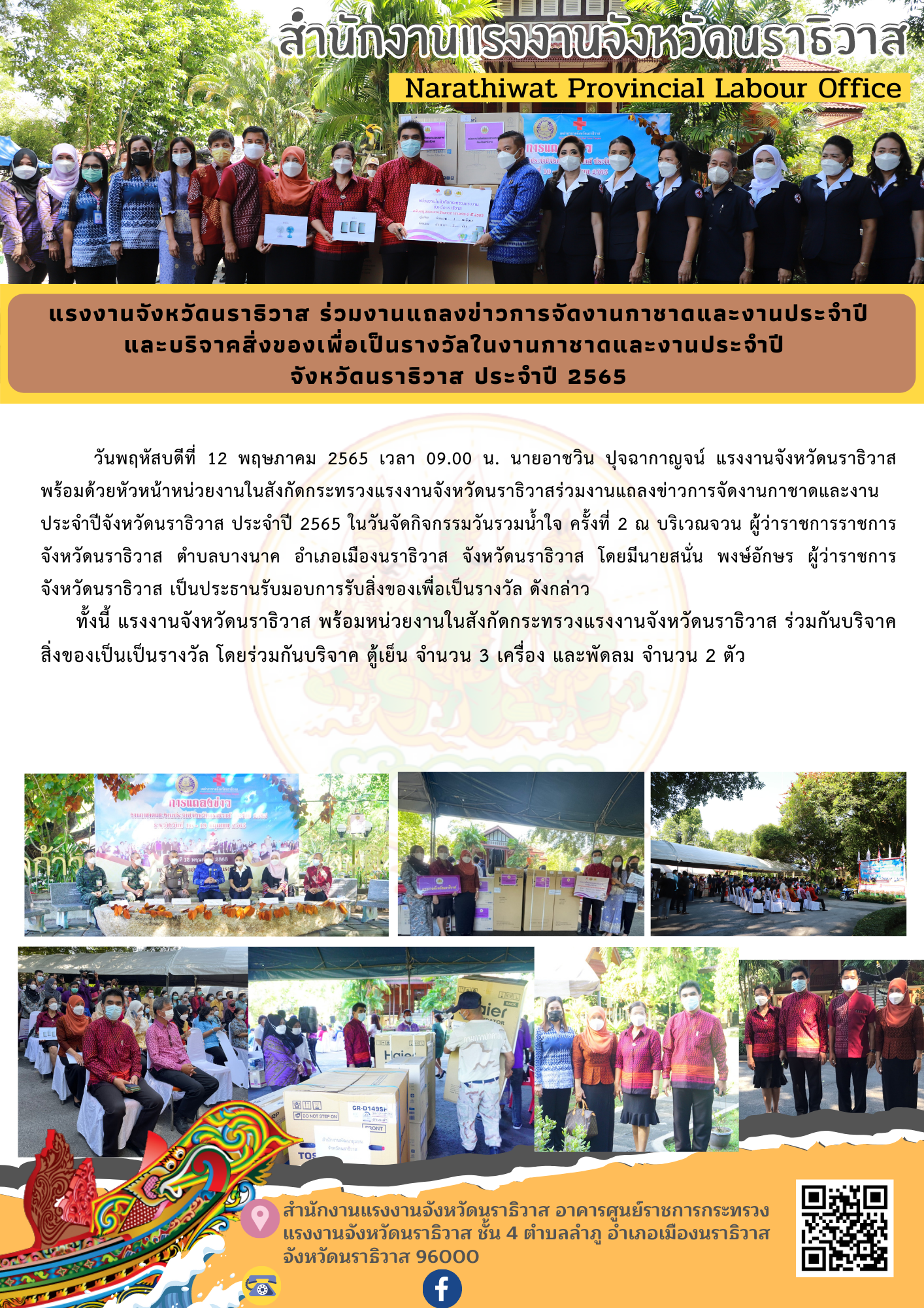 วันพฤหัสบดีที่ 12 พฤษภาคม 2565 เวลา 09.00 น. นายอาชวิน ปุจฉากาญจน์ แรงงานจังหวัดนราธิวาส พร้อมด้วยหัวหน้าหน่วยงานในสังกัดกระทรวงแรงงานจังหวัดนราธิวาสร่วมงานแถลงข่าวการจัดงานกาชาดและงานประจำปีจังหวัดนราธิวาส ประจำปี 2565 ในวันจัดกิจกรรมวันรวมน้ำใจ ครั้งที่ 2 ณ บริเวณจวน ผู้ว่าราชการราชการจังหวัดนราธิวาส ตำบลบางนาค อำเภอเมืองนราธิวาส จังหวัดนราธิวาส โดยมีนายสนั่น พงษ์อักษร ผู้ว่าราชการจังหวัดนราธิวาส เป็นประธานรับมอบการรับสิ่งของเพื่อเป็นรางวัล ดังกล่าว ทั้งนี้ แรงงานจังหวัดนราธิวาส พร้อมหน่วยงานในสังกัดกระทรวงแรงงานจังหวัดนราธิวาส ร่วมกันบริจาคสิ่งของเป็นเป็นรางวัล โดยร่วมกันบริจาค ตู้เย็น จำนวน 3 เครื่อง และพัดลม จำนวน 2 ตัว