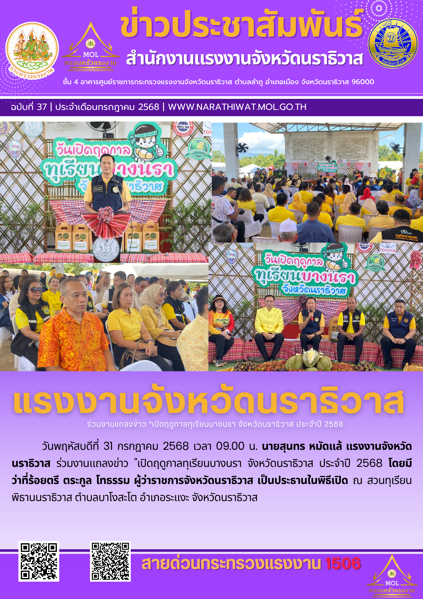 วันพฤหัสบดีที่ 31 กรกฎาคม 2568 เวลา 09.00 น. นายสุนทร หมัดแล้ แรงงานจังหวัดนราธิวาส ร่วมงานแถลงข่าว “เปิดฤดูกาลทุเรียนบางนรา จังหวัดนราธิวาส ประจำปี 2568 โดยมี ว่าที่ร้อยตรี ตระกูล โทธรรม ผู้ว่าราชการจังหวัดนราธิวาส เป็นประธานในพิธีเปิด ณ สวนทุเรียนพิธานนราธิวาส ตำบลบาโงสะโต อำเภอระแงะ จังหวัดนราธิวาส