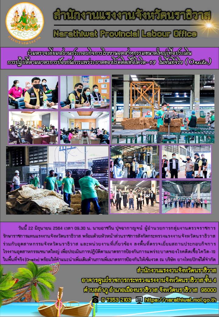 วันนี้ 22 มิถุนายน 2564 เวลา 09.30 น. นายอาชวิน ปุจฉากาญจน์ ผู้อำนวยการกลุ่มงานตรวจราชการรักษาราชการแทนแรงงานจังหวัดนราธิวาส พร้อมด้วยหัวหน้าส่วนราชการสังกัดกระทรวงแรงงานจังหวัดนราธิวาสร่วมกับอุตสาหกรรมจังหวัดนราธิวาส และหน่วยงานที่เกี่ยวข้อง ลงพื้นที่ตรวจเยี่ยมสถานประกอบกิจการโรงงานอุตสาหกรรมขนาดใหญ่ เพื่อประเมินการปฏิบัติตามมาตรการป้องกันการแพร่ระบาดของโรคติดเชื้อโควิด-19ในพื้นที่จริง (Onsite) พร้อมให้คำแนะนำเพิ่มเติมด้านการเพิ่มมาตรการป้องกันให้เข้มงวด ณ บริษัท ยางไทยปักษ์ใต้จำกัด