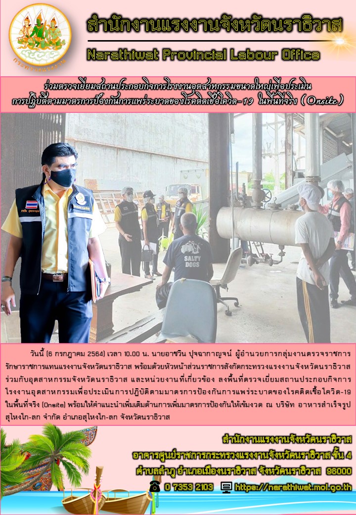 วันนี้ (6 กรกฎาคม 2564) เวลา 10.00 น. นายอาชวิน ปุจฉากาญจน์ ผู้อำนวยการกลุ่มงานตรวจราชการ รักษาราชการแทนแรงงานจังหวัดนราธิวาส พร้อมด้วยหัวหน้าส่วนราชการสังกัดกระทรวงแรงงานจังหวัดนราธิวาส ร่วมกับอุตสาหกรรมจังหวัดนราธิวาส และหน่วยงานที่เกี่ยวข้อง ลงพื้นที่ตรวจเยี่ยมสถานประกอบกิจการโรงงานอุตสาหกรรมเพื่อประเมินการปฏิบัติตามมาตรการป้องกันการแพร่ระบาดของโรคติดเชื้อโควิด-19 ในพื้นที่จริง (Onsite) พร้อมให้คำแนะนำเพิ่มเติมด้านการเพิ่มมาตรการป้องกันให้เข้มงวด ณ บริษัท อาหารสำเร็จรูป สุไหงโก-ลก จำกัด อำเภอสุไหงโก-ลก จังหวัดนราธิวาส