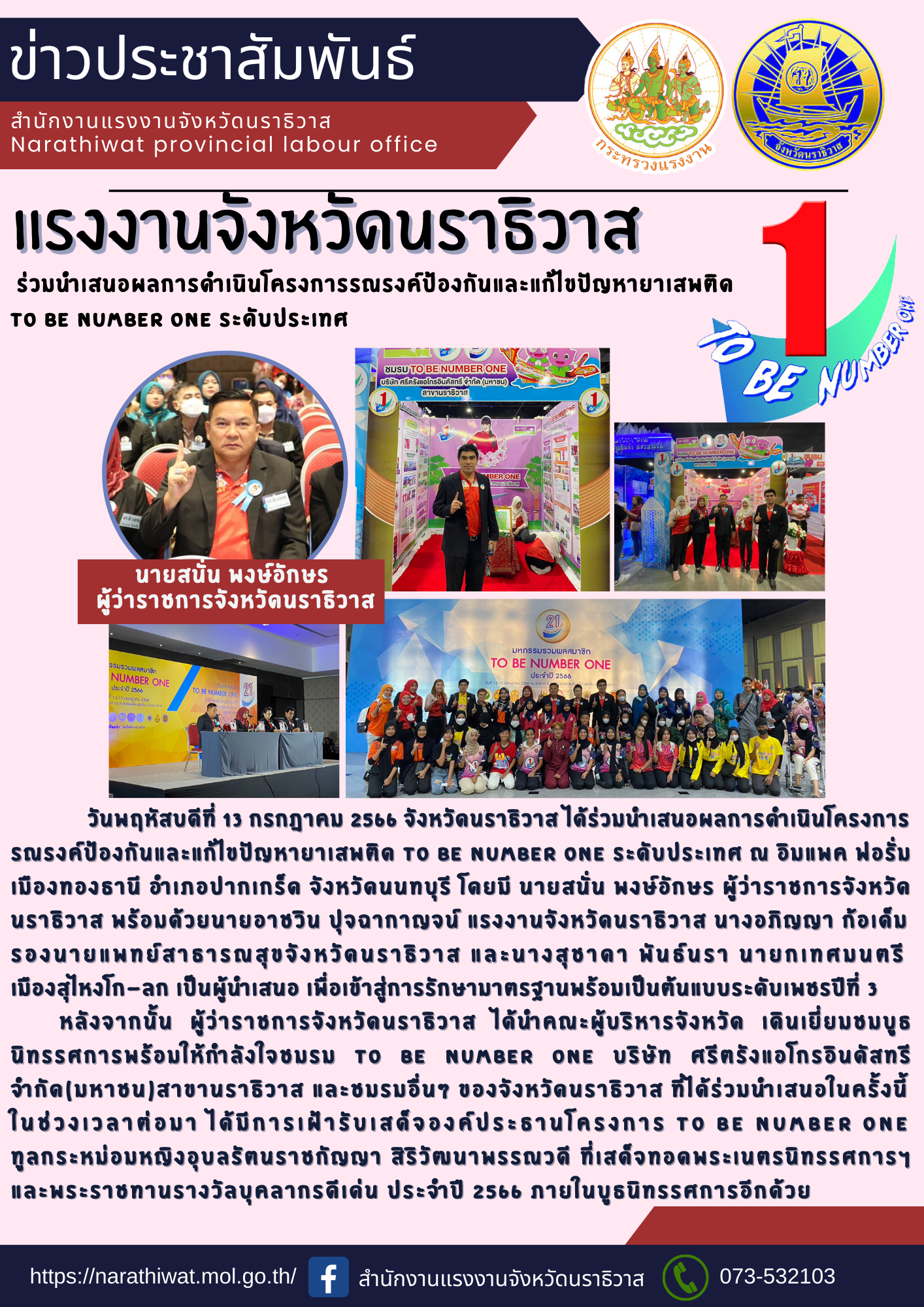 วันพฤหัสบดีที่ 13 กรกฎาคม 2566 จังหวัดนราธิวาส ได้ร่วมนำเสนอผลการดำเนินโครงการรณรงค์ป้องกันและแก้ไขปัญหายาเสพติด TO BE NUMBER ONE ระดับประเทศ ณ อิมแพค ฟอรั่ม เมืองทองธานี อำเภอปากเกร็ด จังหวัดนนทบุรี โดยมี นายสนั่น พงษ์อักษร ผู้ว่าราชการจังหวัดนราธิวาส พร้อมด้วยนายอาชวิน ปุจฉากาญจน์ แรงงานจังหวัดนราธิวาส นางอภิญญา ก้อเด็ม รองนายแพทย์สาธารณสุขจังหวัดนราธิวาส และนางสุชาดา พันธ์นรา นายกเทศมนตรีเมืองสุไหงโก-ลก เป็นผู้นำเสนอ เพื่อเข้าสู่การรักษามาตรฐานพร้อมเป็นต้นแบบระดับเพชรปีที่ 3 หลังจากนั้น ผู้ว่าราชการจังหวัดนราธิวาส ได้นำคณะผู้บริหารจังหวัด เดินเยี่ยมชมบูธนิทรรศการพร้อมให้กำลังใจชมรม TO BE NUMBER ONE บริษัท ศรีตรังแอโกรอินดัสทรี จำกัด(มหาชน)สาขานราธิวาส และชมรมอื่นๆ ของจังหวัดนราธิวาส ที่ได้ร่วมนำเสนอในครั้งนี้ ในช่วงเวลาต่อมา ได้มีการเฝ้ารับเสด็จองค์ประธานโครงการ TO BE NUMBER ONEทูลกระหม่อมหญิงอุบลรัตนราชกัญญา สิริวัฒนาพรรณวดี ที่เสด็จทอดพระเนตรนิทรรศการฯ และพระราชทานรางวัลบุคลากรดีเด่น ประจำปี 2566 ภายในบูธนิทรรศการอีกด้วย