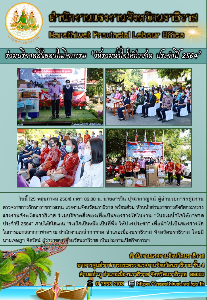 วันนี้ (25 พฤษภาคม 2564) เวลา 09.00 น. นายอาชวิน ปุจฉากาญจน์ ผู้อำนวยการกลุ่มงานตรวจราชการรักษาราชการแทน แรงงานจังหวัดนราธิวาส พร้อมด้วย หัวหน้าส่วนราชการสังกัดกระทรวงแรงงานจังหวัดนราธิวาส ร่วมบริจาคสิ่งของเพื่อเป็นของรางวัลในงาน “วันรวมน้ำใจให้กาชาดประจำปี 2564” ภายใต้สโลแกน “รวมใจเป็นหนึ่ง เป็นที่พึ่ง ให้ปวงประชา” เพื่อนำไปเป็นของรางวัลในการออกสลากกาชาดฯ ณ สำนักงานเหล่ากาชาด อำเภอเมืองนราธิวาส จังหวัดนราธิวาส โดยมี นายเจษฎา จิตรัตน์ ผู้ว่าราชการจังหวัดนราธิวาส เป็นประธานเปิดกิจกรรมฯ