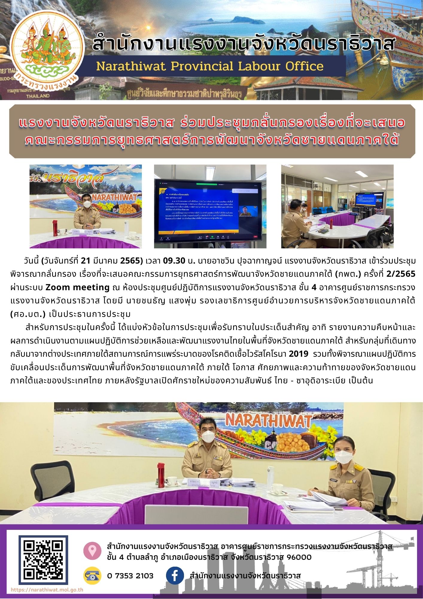 วันนี้ (วันจันทร์ที่ 21 มีนาคม 2565) เวลา 09.30 น. นายอาชวิน ปุจฉากาญจน์ แรงงานจังหวัดนราธิวาส เข้าร่วมประชุมพิจารณากลั่นกรอง เรื่องที่จะเสนอคณะกรรมการยุทธศาสตร์การพัฒนาจังหวัดชายแดนภาคใต้ (กพต.) ครั้งที่ 2/2565 ผ่านระบบ Zoom meeting ณ ห้องประชุมศูนย์ปฏิบัติการแรงงานจังหวัดนราธิวาส ชั้น 4 อาคารศูนย์ราชการกระทรวงแรงงานจังหวัดนราธิวาส โดยมี นายชนธัญ แสงพุ่ม รองเลขาธิการศูนย์อำนวยการบริหารจังหวัดชายแดนภาคใต้ (ศอ.บต.) เป็นประธานการประชุม