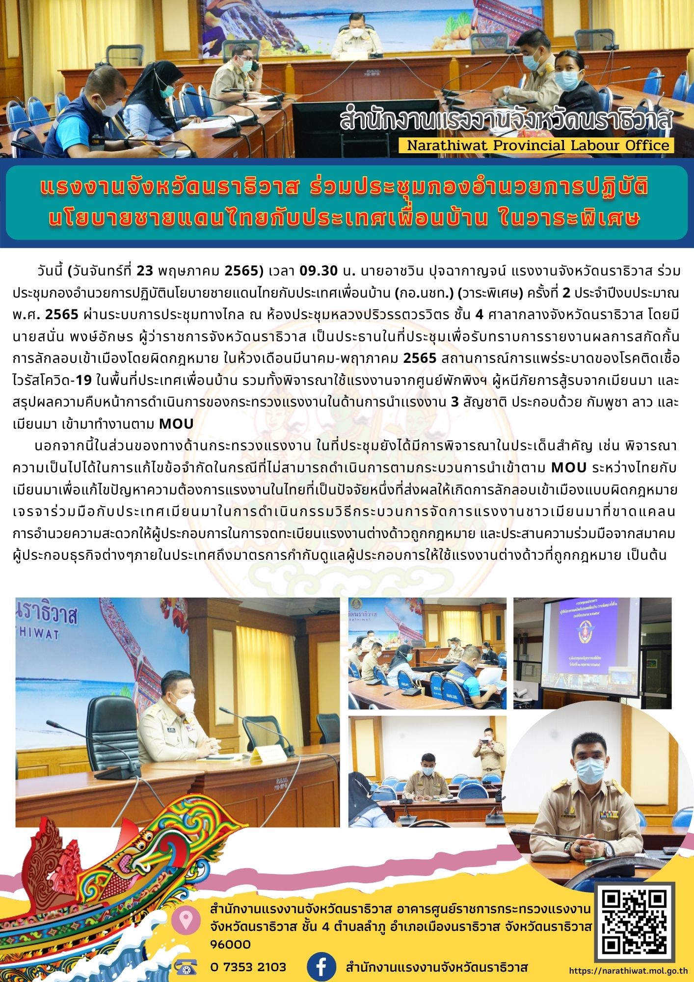 วันนี้ (วันจันทร์ที่ 23 พฤษภาคม 2565) เวลา 09.30 น. นายอาชวิน ปุจฉากาญจน์ แรงงานจังหวัดนราธิวาส ร่วมประชุมกองอำนวยการปฏิบัตินโยบายชายแดนไทยกับประเทศเพื่อนบ้าน (กอ.นชท.) (วาระพิเศษ) ครั้งที่ 2 ประจำปีงบประมาณ พ.ศ. 2565 ผ่านระบบการประชุมทางไกล ณ ห้องประชุมหลวงปริวรรตวรวิตร ชั้น 4 ศาลากลางจังหวัดนราธิวาส โดยมี นายสนั่น พงษ์อักษร ผู้ว่าราชการจังหวัดนราธิวาส เป็นประธานในที่ประชุมเพื่อรับทราบการรายงานผลการสกัดกั้นการลักลอบเข้าเมืองโดยผิดกฎหมาย ในห้วงเดือนมีนาคม-พฤาภาคม 2565 สถานการณ์การแพร่ระบาดของโรคติดเชื้อไวรัสโควิด-19 ในพื้นที่ประเทศเพื่อนบ้าน รวมทั้งพิจารณาใช้แรงงานจากศูนย์พักพิงฯ ผู้หนีภัยการสู้รบจากเมียนมา และสรุปผลความคืบหน้าการดำเนินการของกระทรวงแรงงานในด้านการนำเเรงงาน 3 สัญชาติ ประกอบด้วย กัมพูชา ลาว และเมียนมา เข้ามาทำงานตาม MOU