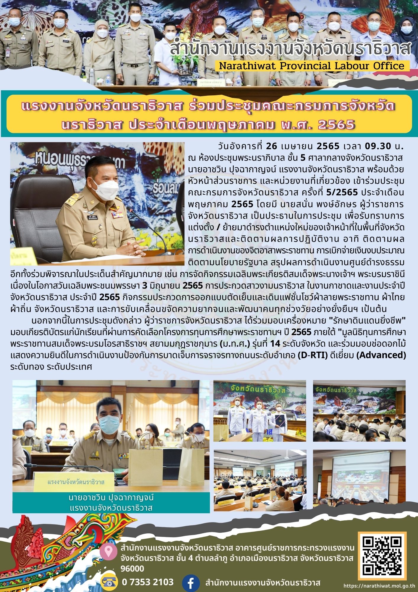 วันอังคารที่ 26 เมษายน 2565 เวลา 09.30 น. ณ ห้องประชุมพระนราภิบาล ชั้น 5 ศาลากลางจังหวัดนราธิวาส นายอาชวิน ปุจฉากาญจน์ แรงงานจังหวัดนราธิวาส พร้อมด้วยหัวหน้าส่วนราชการ และหน่วยงานที่เกี่ยวข้อง เข้าร่วมประชุมคณะกรมการจังหวัดนราธิวาส ครั้งที่ 5/2565 ประจำเดือนพฤษภาคม 2565 โดยมี นายสนั่น พงษ์อักษร ผู้ว่าราชการจังหวัดนราธิวาส เป็นประธานในการประชุม เพื่อรับทราบการแต่งตั้ง / ย้ายมาดำรงตำแหน่งใหม่ของเจ้าหน้าที่ในพื้นที่จังหวัดนราธิวาสและติดตามผลการปฏิบัติงาน อาทิ ติดตามผลการดำเนินงานของจิตอาสาพระราชทาน การเบิกจ่ายเงินงบประมาณ ติดตามนโยบายรัฐบาล สรุปผลการดำเนินงานศูนย์ดำรงธรรม
