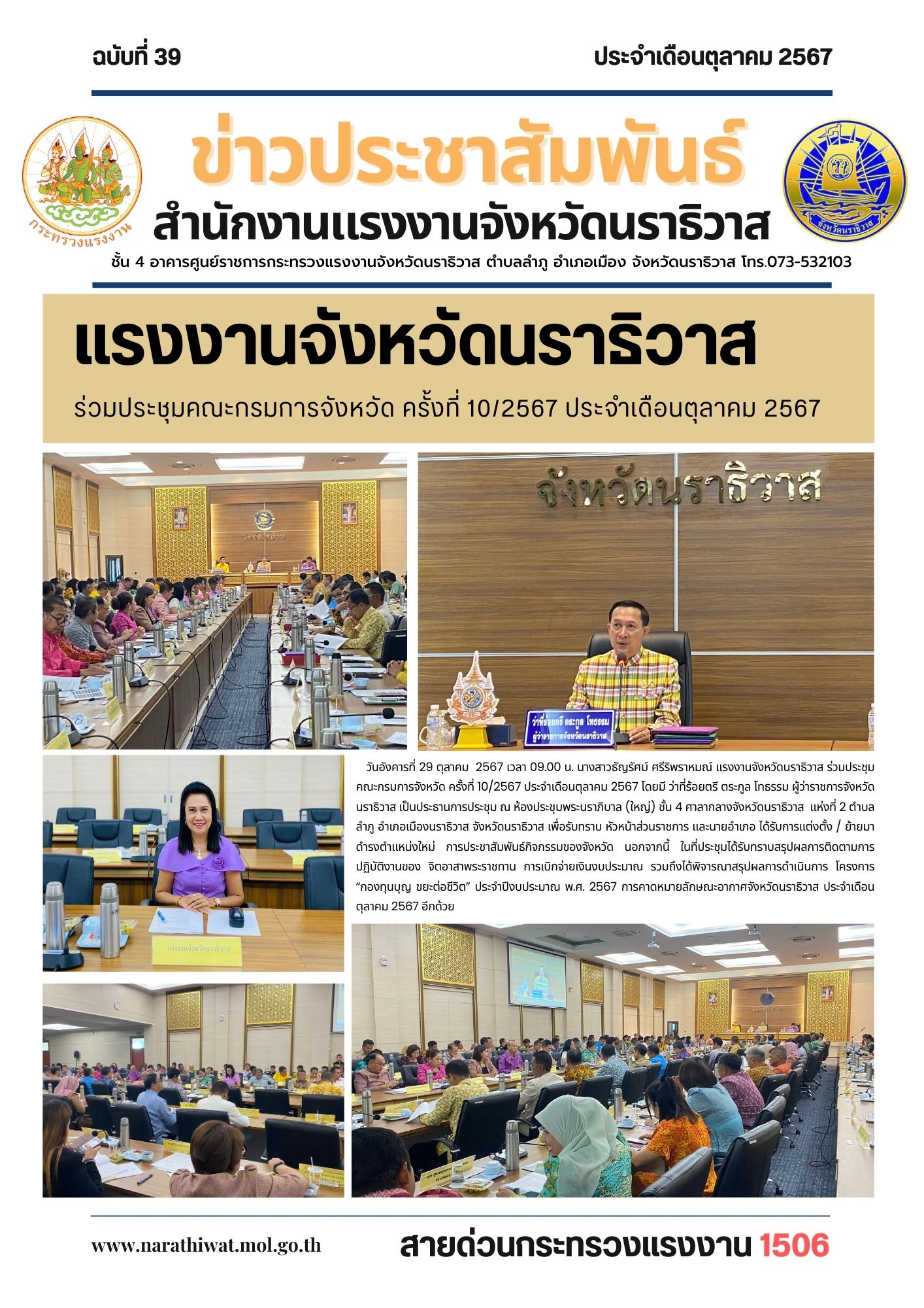 วันอังคารที่ 29 ตุลาคม 2567 เวลา 09.00 น. นางสาวธัญรัศม์ ศรีริพราหมณ์ แรงงานจังหวัดนราธิวาส ร่วมประชุมคณะกรมการจังหวัด ครั้งที่ 10/2567 ประจำเดือนตุลาคม 2567 โดยมี ว่าที่ร้อยตรี ตระกูล โทธรรม ผู้ว่าราชการจังหวัดนราธิวาส เป็นประธานการประชุม ณ ห้องประชุมพระนราภิบาล (ใหญ่) ชั้น 4 ศาลากลางจังหวัดนราธิวาส แห่งที่ 2 ตำบลลำภู อำเภอเมืองนราธิวาส จังหวัดนราธิวาส เพื่อรับทราบ หัวหน้าส่วนราชการ และนายอำเภอ ได้รับการแต่งตั้ง / ย้ายมาดำรงตำแหน่งใหม่ การประชาสัมพันธ์กิจกรรมของจังหวัด นอกจากนี้ ในที่ประชุมได้รับทราบสรุปผลการติดตามการปฏิบัติงานของ จิตอาสาพระราชทาน การเบิกจ่ายเงินงบประมาณ รวมถึงได้พิจารณาสรุปผลการดำเนินการ โครงการ “กองทุนบุญ ขยะต่อชีวิต” ประจำปีงบประมาณ พ.ศ. 2567 การคาดหมายลักษณะอากาศจังหวัดนราธิวาส ประจำเดือนตุลาคม 2567 อีกด้วย
