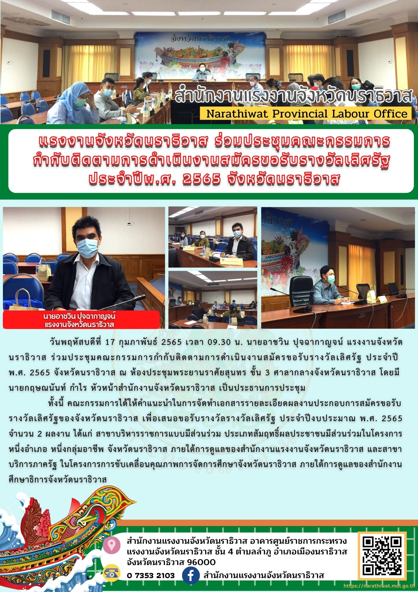 วันพฤหัสบดีที่ 17 กุมภาพันธ์ 2565 เวลา 09.30 น. นายอาชวิน ปุจฉากาญจน์ แรงงานจังหวัดนราธิวาส ร่วมประชุมคณะกรรมการกำกับติดตามการดำเนินงานสมัครขอรับรางวัลเลิศรัฐ ประจำปี พ.ศ. 2565 จังหวัดนราธิวาส ณ ห้องประชุมพระยานราศัยสุนทร ชั้น 3 ศาลากลางจังหวัดนราธิวาส โดยมี นายกฤษณนันท์ กำไร หัวหน้าสำนักงานจังหวัดนราธิวาส เป็นประธานการประชุม