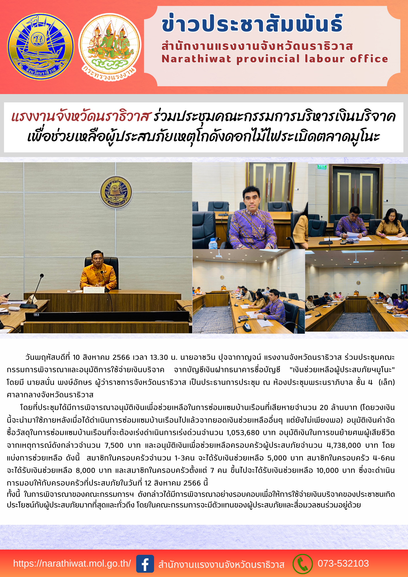 วันพฤหัสบดีที่ 10 สิงหาคม 2566 เวลา 13.30 น. นายอาชวิน ปุจฉากาญจน์ แรงงานจังหวัดนราธิวาส ร่วมประชุมคณะกรรมการพิจารณาและอนุมัติการใช้จ่ายเงินบริจาค จากบัญชีเงินฝากธนาคารชื่อบัญชี “เงินช่วยเหลือผู้ประสบภัยฯมูโนะ” โดยมี นายสนั่น พงษ์อักษร ผู้ว่าราชการจังหวัดนราธิวาส เป็นประธานการประชุม ณ ห้องประชุมพระนราภิบาล ชั้น 4 (เล็ก) ศาลากลางจังหวัดนราธิวาส