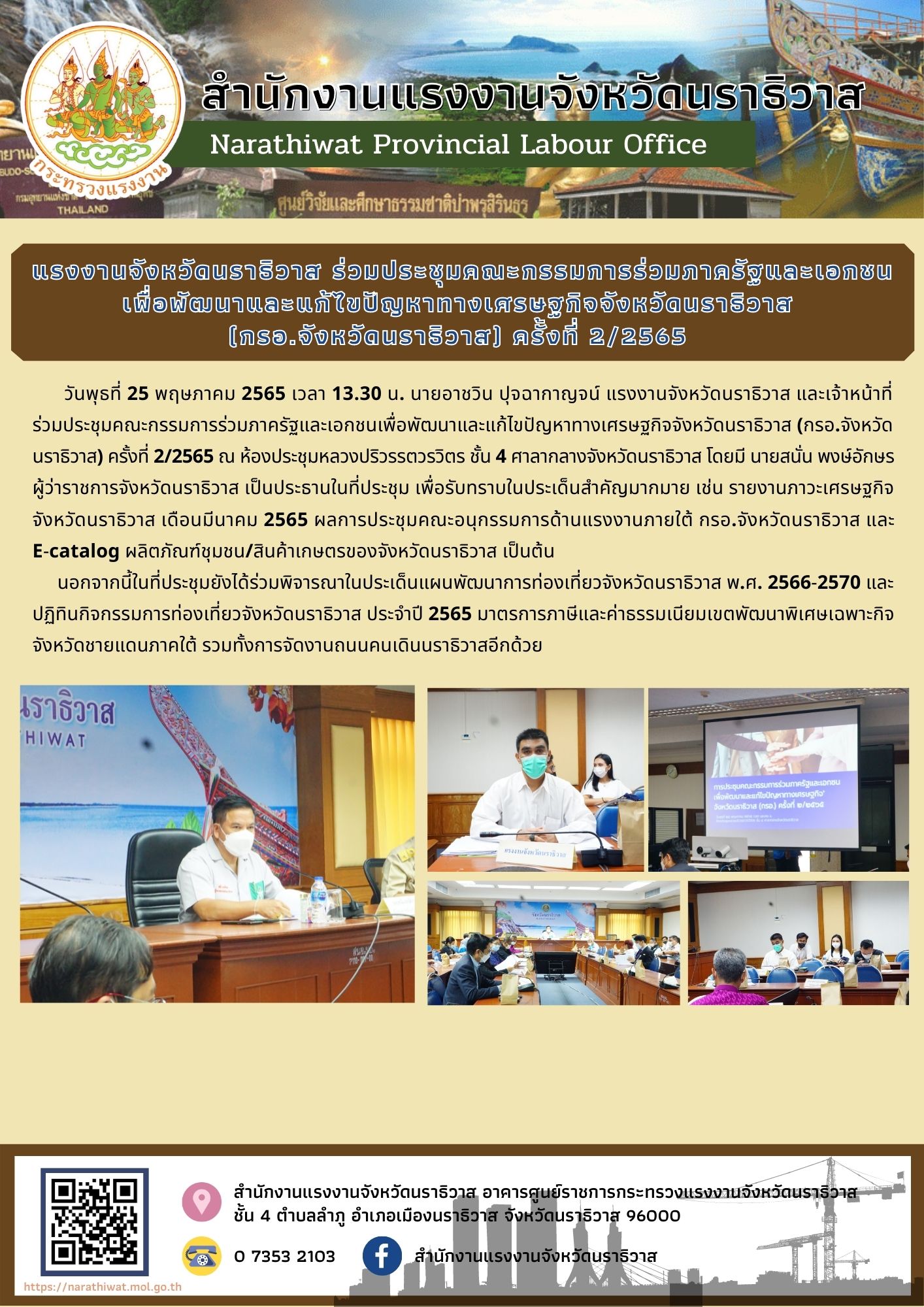 วันพุธที่ 25 พฤษภาคม 2565 เวลา 13.30 น. นายอาชวิน ปุจฉากาญจน์ แรงงานจังหวัดนราธิวาส และเจ้าหน้าที่ ร่วมประชุมคณะกรรมการร่วมภาครัฐและเอกชนเพื่อพัฒนาและแก้ไขปัญหาทางเศรษฐกิจจังหวัดนราธิวาส (กรอ.จังหวัดนราธิวาส) ครั้งที่ 2/2565 ณ ห้องประชุมหลวงปริวรรตวรวิตร ชั้น 4 ศาลากลางจังหวัดนราธิวาส โดยมี นายสนั่น พงษ์อักษร ผู้ว่าราชการจังหวัดนราธิวาส เป็นประธานในที่ประชุม เพื่อรับทราบในประเด็นสำคัญมากมาย เช่น รายงานภาวะเศรษฐกิจจังหวัดนราธิวาส เดือนมีนาคม 2565 ผลการประชุมคณะอนุกรรมการด้านแรงงานภายใต้ กรอ.จังหวัดนราธิวาส และ E-catalog ผลิตภัณฑ์ชุมชน/สินค้าเกษตรของจังหวัดนราธิวาส เป็นต้น