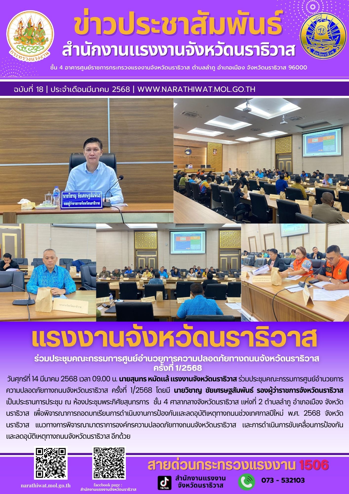 วันศุกร์ที่ 14 มีนาคม 2568 เวลา 09.00 น. นายสุนทร หมัดแล้ แรงงานจังหวัดนราธิวาส ร่วมประชุมคณะกรรมการศูนย์อำนวยการความปลอดภัยทางถนนจังหวัดนราธิวาส ครั้งที่ 1/2568 โดยมี นายวิชาญ ชัยเศรษฐสัมพันธ์ รองผู้ว่าราชการจังหวัดนราธิวาส เป็นประธานการประชุม ณ ห้องประชุมพระภิศัยสุนทรการ ชั้น 4 ศาลากลางจังหวัดนราธิวาส แห่งที่ 2 ตำบลลำภู อำเภอเมือง จังหวัดนราธิวาส เพื่อพิจารณาการถอดบทเรียนการดำเนินงานการป้องกันและลดอุบัติเหตุทางถนนช่วงเทศกาลปีใหม่ พ.ศ. 2568 จังหวัดนราธิวาส เเนวทางการพิจารณามาตราการองค์กรความปลอดภัยทางถนนจังหวัดนราธิวาส และการดำเนินการขับเคลื่อนการป้องกันและลดอุบัติเหตุทางถนนจังหวัดนราธิวาส อีกด้วย