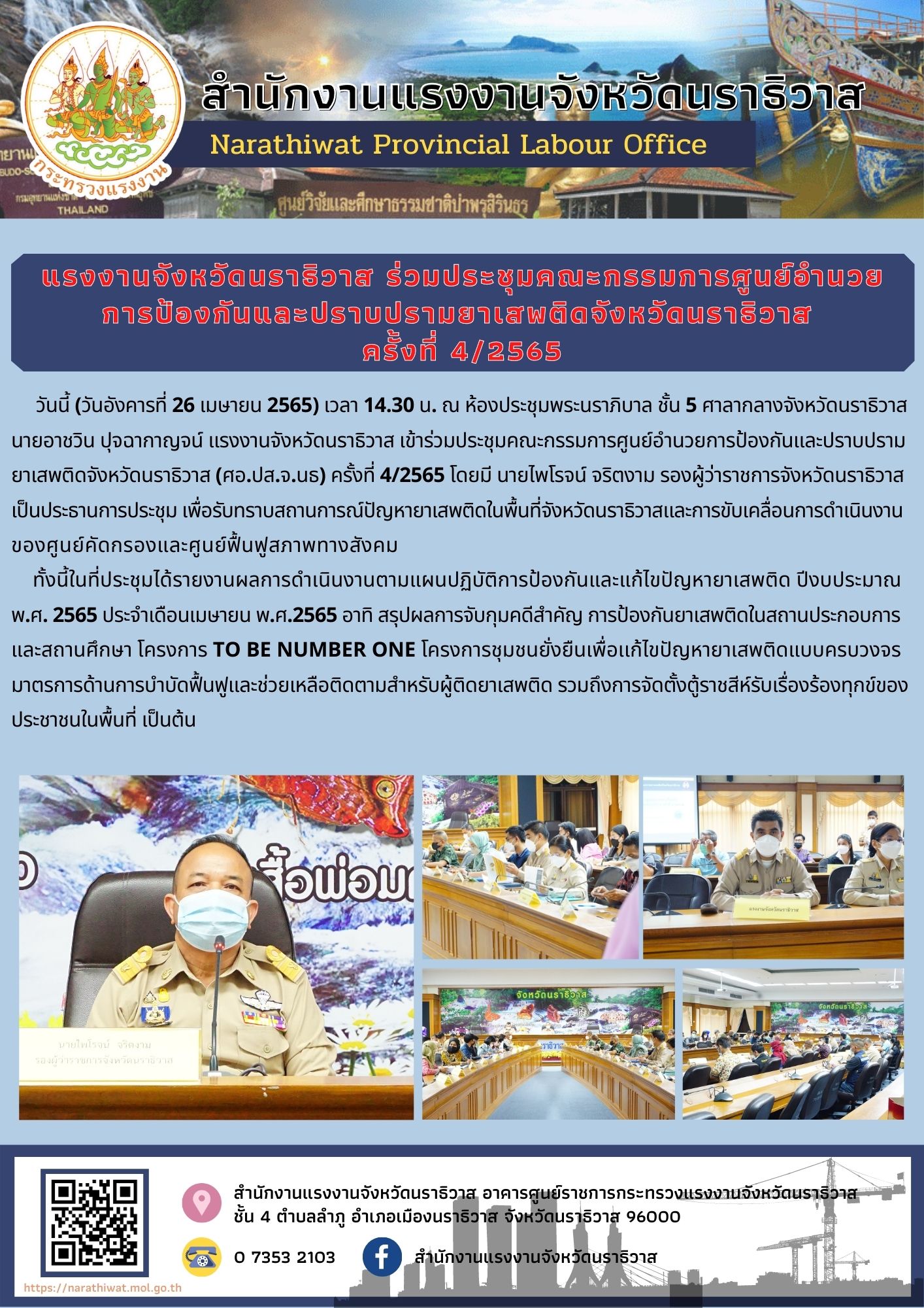 วันนี้ (วันอังคารที่ 26 เมษายน 2565) เวลา 14.30 น. ณ ห้องประชุมพระนราภิบาล ชั้น 5 ศาลากลางจังหวัดนราธิวาส นายอาชวิน ปุจฉากาญจน์ แรงงานจังหวัดนราธิวาส เข้าร่วมประชุมคณะกรรมการศูนย์อำนวยการป้องกันและปราบปรามยาเสพติดจังหวัดนราธิวาส (ศอ.ปส.จ.นธ) ครั้งที่ 4/2565 โดยมี นายไพโรจน์ จริตงาม รองผู้ว่าราชการจังหวัดนราธิวาส เป็นประธานการประชุม เพื่อรับทราบสถานการณ์ปัญหายาเสพติดในพื้นที่จังหวัดนราธิวาสและการขับเคลื่อนการดำเนินงานของศูนย์คัดกรองและศูนย์ฟื้นฟูสภาพทางสังคม