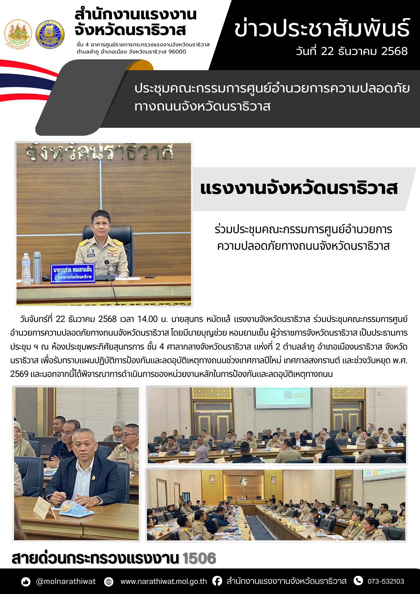 วันจันทร์ที่ 22 ธันวาคม 2568 เวลา 14.00 น. นายสุนทร หมัดแล้ แรงงานจังหวัดนราธิวาส ร่วมประชุมคณะกรรมการศูนย์อำนวยการความปลอดภัยทางถนนจังหวัดนราธิวาส โดยมีนายบุญช่วย หอมยามเย็น ผู้ว่าราชการจังหวัดนราธิวาส เป็นประธานการประชุม ฯ ณ ห้องประชุมพระภิศัยสุนทรการ ชั้น 4 ศาลากลางจังหวัดนราธิวาส แห่งที่ 2 ตำบลลำภู อำเภอเมืองนราธิวาส จังหวัดนราธิวาส เพื่อรับทราบแผนปฏิบัติการป้องกันและลดอุบัติเหตุทางถนนช่วงเทศกาลปีใหม่ เทศกาลสงกรานต์ และช่วงวันหยุด พ.ศ. 2569 และนอกจากนี้ได้พิจารณาการดำเนินการของหน่วยงานหลักในการป้องกันและลดอุบัติเหตุทางถนน