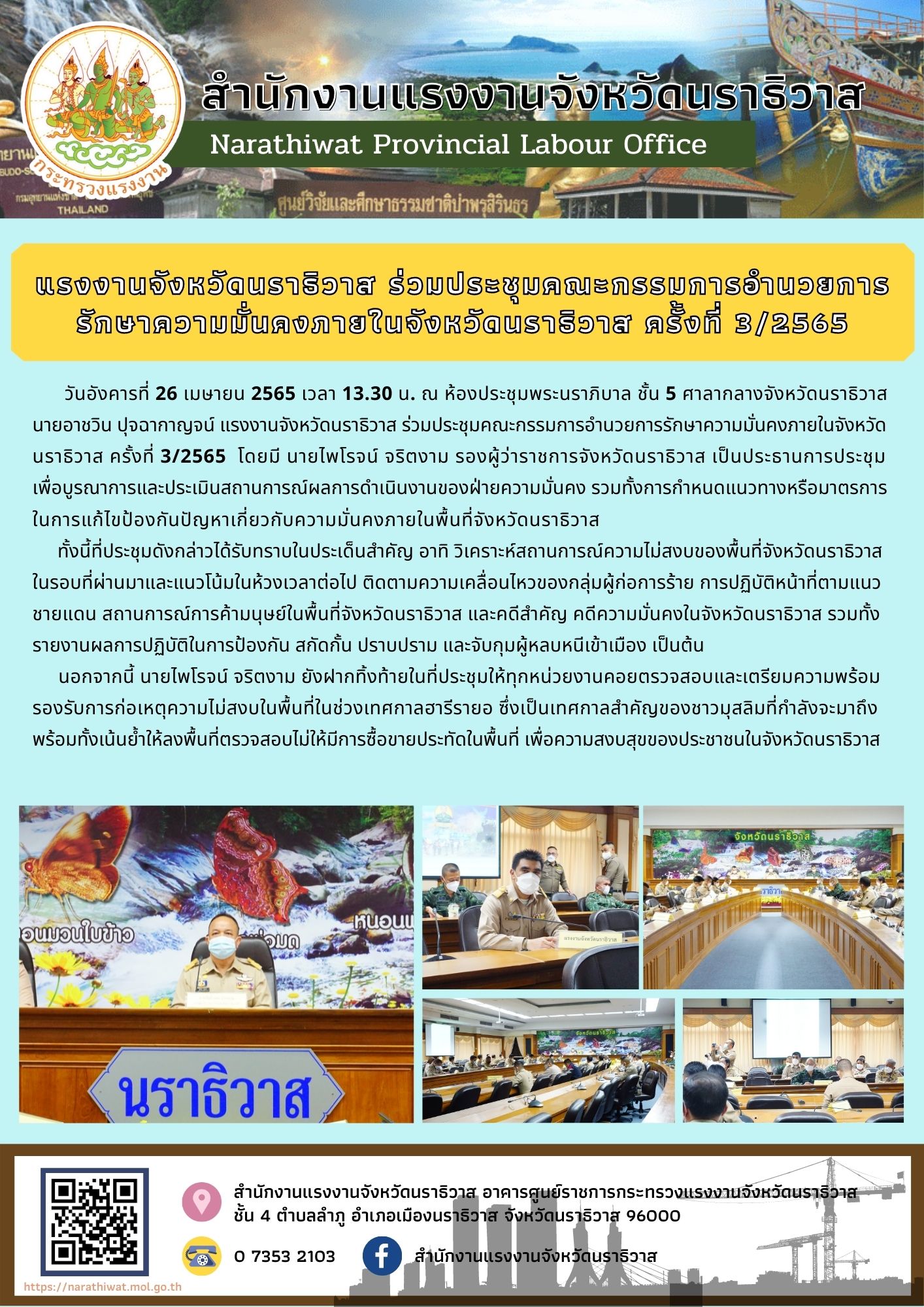 วันอังคารที่ 26 เมษายน 2565 เวลา 13.30 น. ณ ห้องประชุมพระนราภิบาล ชั้น 5 ศาลากลางจังหวัดนราธิวาส นายอาชวิน ปุจฉากาญจน์ แรงงานจังหวัดนราธิวาส ร่วมประชุมคณะกรรมการอำนวยการรักษาความมั่นคงภายในจังหวัดนราธิวาส ครั้งที่ 3/2565 โดยมี นายไพโรจน์ จริตงาม รองผู้ว่าราชการจังหวัดนราธิวาส เป็นประธานการประชุมเพื่อบูรณาการและประเมินสถานการณ์ผลการดำเนินงานของฝ่ายความมั่นคง รวมทั้งการกำหนดแนวทางหรือมาตรการในการแก้ไขป้องกันปัญหาเกี่ยวกับความมั่นคงภายในพื้นที่จังหวัดนราธิวาส