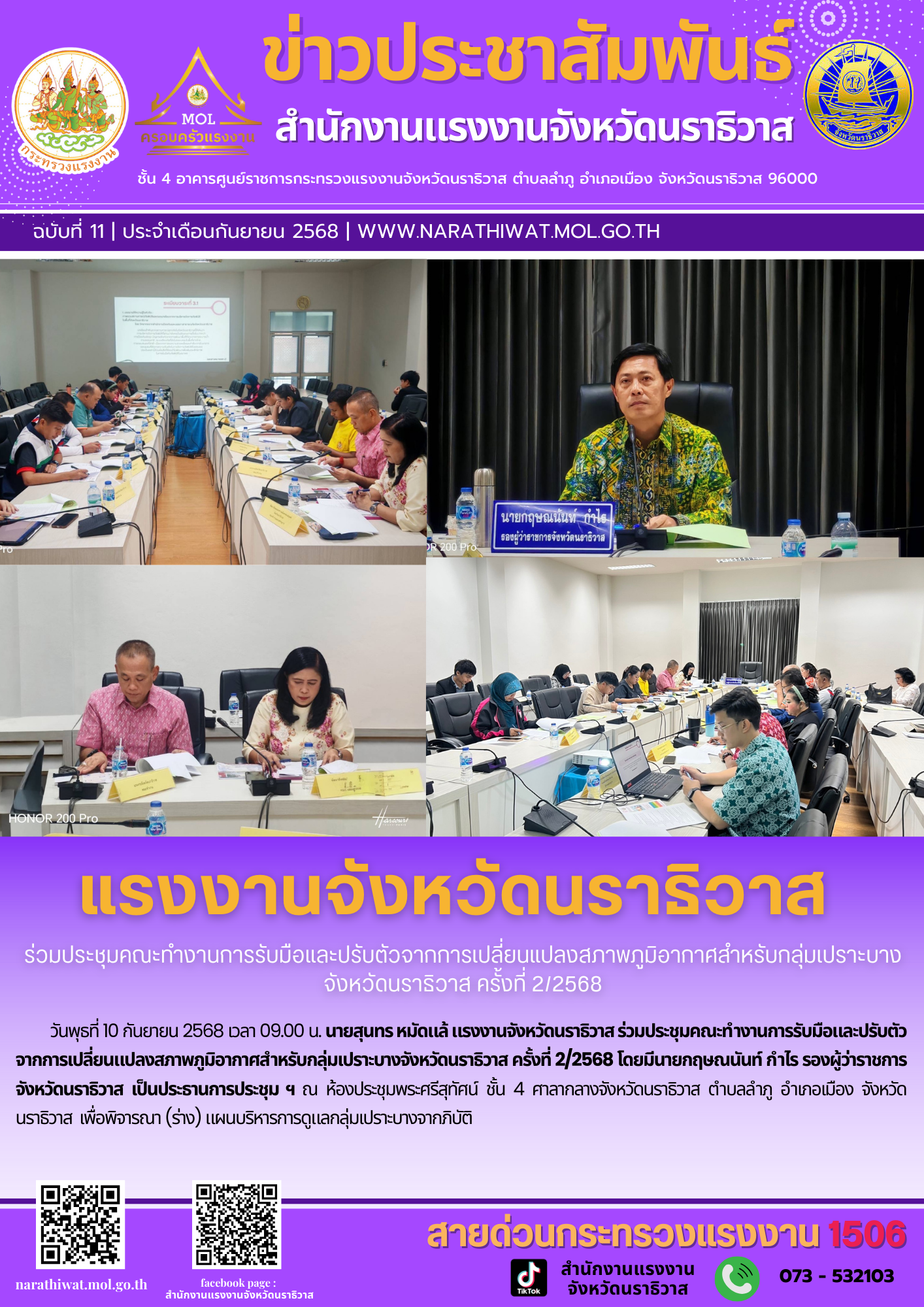 วันพุธที่ 10 กันยายน 2568 เวลา 09.00 น. นายสุนทร หมัดแล้ แรงงานจังหวัดนราธิวาส ร่วมประชุมคณะทำงานการรับมือและปรับตัวจากการเปลี่ยนแปลงสภาพภูมิอากาศสำหรับกลุ่มเปราะบางจังหวัดนราธิวาส ครั้งที่ 2/2568 โดยมีนายกฤษณนันท์ กำไร รองผู้ว่าราชการจังหวัดนราธิวาส เป็นประธานการประชุม ฯ ณ ห้องประชุมพระศรีสุทัศน์ ชั้น 4 ศาลากลางจังหวัดนราธิวาส ตำบลลำภู อำเภอเมือง จังหวัดนราธิวาส เพื่อพิจารณา (ร่าง) แผนบริหารการดูแลกลุ่มเปราะบางจากภิบัติ
