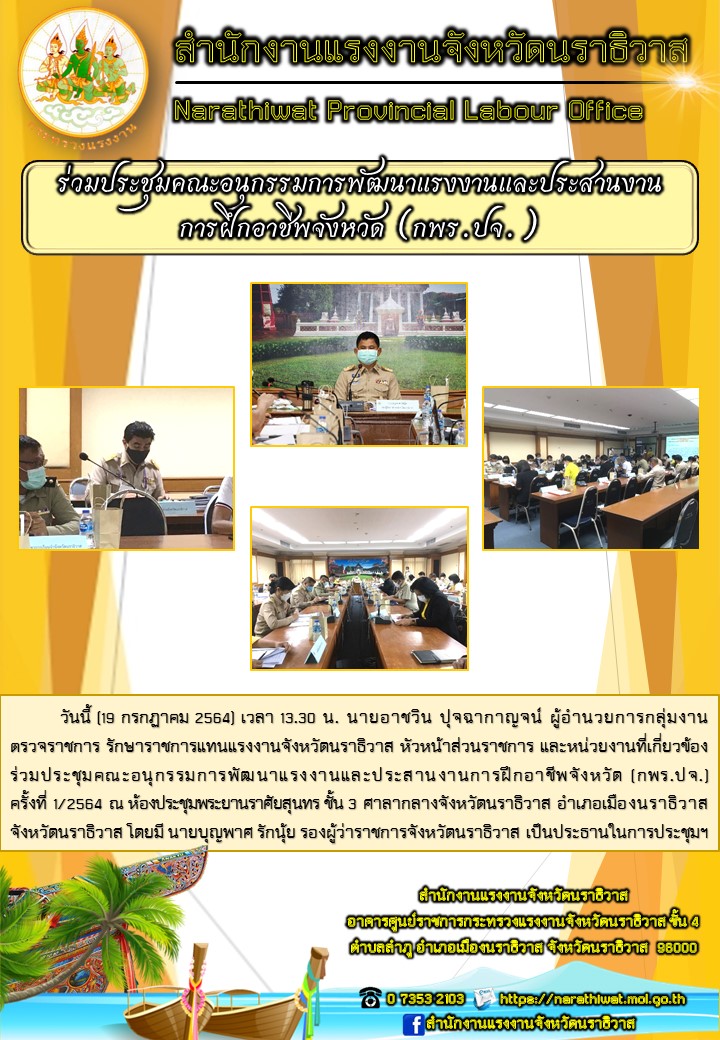 วันนี้ (19 กรกฏาคม 2564) เวลา 13.30 น. นายอาชวิน ปุจฉากาญจน์ ผู้อำนวยการกลุ่มงานตรวจราชการ รักษาราชการแทนแรงงานจังหวัดนราธิวาส หัวหน้าส่วนราชการ และหน่วยงานที่เกี่ยวข้อง ร่วมประชุมคณะอนุกรรมการพัฒนาแรงงานและประสานงานการฝึกอาชีพจังหวัด (กพร.ปจ.) ครั้งที่ 1/2564 ณ ห้องประชุมพระยานราศัยสุนทร ชั้น 3 ศาลากลางจังหวัดนราธิวาส อำเภอเมืองนราธิวาส จังหวัดนราธิวาส โดยมี นายบุญพาศ รักนุ้ยรองผู้ว่าราชการจังหวัดนราธิวาส เป็นประธานในการประชุมฯ