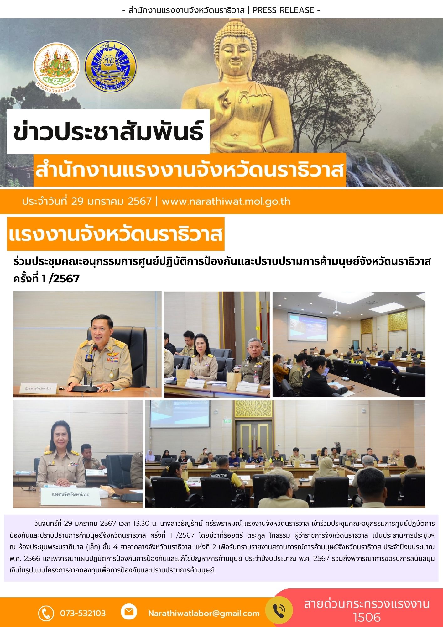 วันจันทร์ที่ 29 มกราคม 2567 เวลา 13.30 น. นางสาวธัญรัศม์ ศรีริพราหมณ์ แรงงานจังหวัดนราธิวาส เข้าร่วมประชุมคณะอนุกรรมการศูนย์ปฏิบัติการป้องกันและปราบปรามการค้ามนุษย์จังหวัดนราธิวาส ครั้งที่ 1 /2567 โดยมีว่าที่ร้อยตรี ตระกูล โทธรรม ผู้ว่าราชการจังหวัดนราธิวาส เป็นประธานการประชุมฯ ณ ห้องประชุมพระนราภิบาล (เล็ก) ชั้น 4 ศาลากลางจังหวัดนราธิวาส แห่งที่ 2 เพื่อรับทราบรายงานสถานการณ์การค้ามนุษย์จังหวัดนราธิวาส ประจำปีงบประมาณ พ.ศ. 2566 และพิจารณาแผนปฏิบัติการป้องกันการป้องกันและแก้ไขปัญหาการค้ามนุษย์ ประจำปีงบประมาณ พ.ศ. 2567 รวมถึงพิจารณาการขอรับการสนับสนุนเงินในรูปแบบโครงการจากกองทุนเพื่อการป้องกันและปราบปรามการค้ามนุษย์