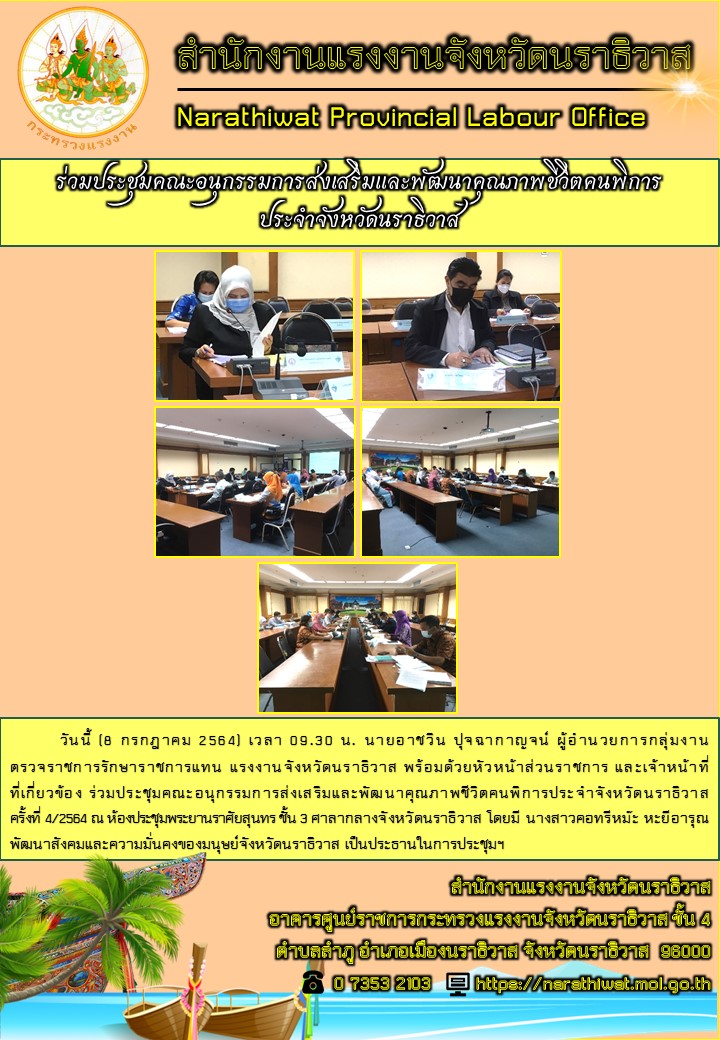 วันนี้ (8 กรกฎาคม 2564) เวลา 09.30 น. นายอาชวิน ปุจฉากาญจน์ ผู้อำนวยการกลุ่มงานตรวจราชการรักษาราชการแทน แรงงานจังหวัดนราธิวาส พร้อมด้วยหัวหน้าส่วนราชการ และเจ้าหน้าที่ที่เกี่ยวข้อง ร่วมประชุมคณะอนุกรรมการส่งเสริมและพัฒนาคุณภาพชีวิตคนพิการประจำจังหวัดนราธิวาส ครั้งที่ 4/2564 ณ ห้องประชุมพระยานราศัยสุนทร ชั้น 3 ศาลากลางจังหวัดนราธิวาส โดยมี นางสาวคอทรีหม๊ะ หะยีอารุณพัฒนาสังคมและความมั่นคงของมนุษย์จังหวัดนราธิวาส เป็นประธานในการประชุมฯ