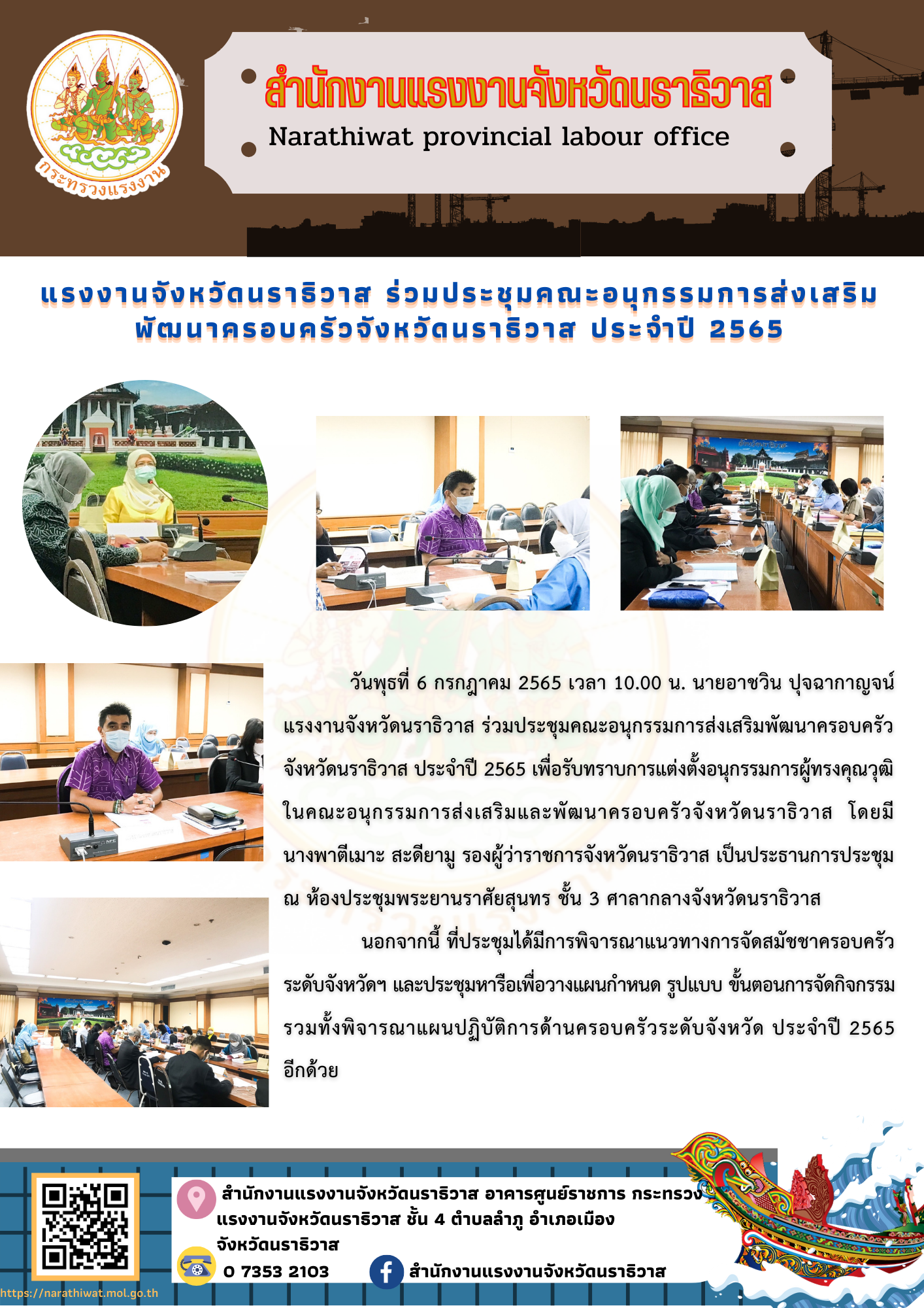 วันพุธที่ 6 กรกฎาคม 2565 เวลา 10.00 น. นายอาชวิน ปุจฉากาญจน์ แรงงานจังหวัดนราธิวาส ร่วมประชุมคณะอนุกรรมการส่งเสริมพัฒนาครอบครัวจังหวัดนราธิวาส ประจำปี 2565 เพื่อรับทราบการแต่งตั้งอนุกรรมการผู้ทรงคุณวุฒิในคณะอนุกรรมการส่งเสริมและพัฒนาครอบครัวจังหวัดนราธิวาส โดยมี นางพาตีเมาะ สะดียามู รองผู้ว่าราชการจังหวัดนราธิวาส เป็นประธานการประชุม ณ ห้องประชุมพระยานราศัยสุนทร ชั้น 3 ศาลากลางจังหวัดนราธิวาส