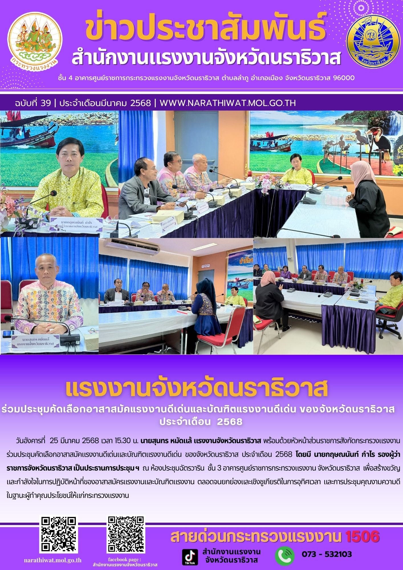 วันอังคารที่ 25 มีนาคม 2568 เวลา 15.30 น. นายสุนทร หมัดแล้ แรงงานจังหวัดนราธิวาส พร้อมด้วยหัวหน้าส่วนราชการสังกัดกระทรวงแรงงาน ร่วมประชุมคัดเลือกอาสาสมัคแรงงานดีเด่นและบัณฑิตแรงงานดีเด่น ของจังหวัดนราธิวาส ประจำเดือน 2568 โดยมี นายกฤษณนันท์ กำไร รองผู้ว่าราชการจังหวัดนราธิวาส เป็นประธานการประชุม ฯ ณ ห้องประชุมฉัตรวาริน ชั้น 3 อาคารศูนย์ราชการกระทรวงแรงงาน จังหวัดนราธิวาส เพื่อสร้างขวัญและกำลังใจในการปฏิบัติหน้าที่ของอาสาสมัครแรงงานและบัณฑิตแรงงาน ตลอดจนยกย่องและเชิงชูเกียรติในการอุทิศเวลา และการประชุมคุณงามความดีในฐานะผูัทำคุณประโยชน์ให้แก่กระทรวงแรงงาน