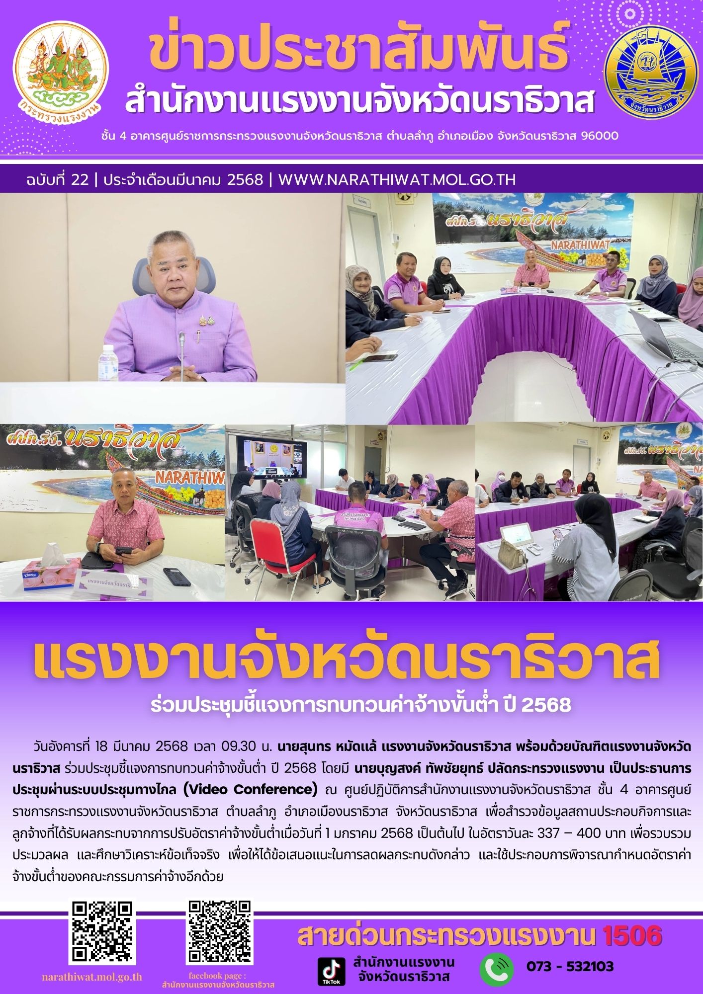 วันอังคารที่ 18 มีนาคม 2568 เวลา 09.30 น. นายสุนทร หมัดแล้ แรงงานจังหวัดนราธิวาส พร้อมด้วยบัณฑิตแรงงานจังหวัดนราธิวาส ร่วมประชุมชี้แจงการทบทวนค่าจ้างขั้นต่ำ ปี 2568 โดยมี นายบุญสงค์ ทัพชัยยุทธ์ ปลัดกระทรวงแรงงาน เป็นประธานการประชุมผ่านระบบประชุมทางไกล (Video Conference) ณ ศูนย์ปฏิบัติการสำนักงานแรงงานจังหวัดนราธิวาส ชั้น 4 อาคารศูนย์ราชการกระทรวงแรงงานจังหวัดนราธิวาส ตำบลลำภู อำเภอเมืองนราธิวาส จังหวัดนราธิวาส เพื่อสำรวจข้อมูลสถานประกอบกิจการและลูกจ้างที่ได้รับผลกระทบจากการปรับอัตราค่าจ้างขั้นต่ำเมื่อวันที่ 1 มกราคม 2568 เป็นต้นไป ในอัตราวันละ 337 – 400 บาท เพื่อรวบรวมประมวลผล และศึกษาวิเคราะห์ข้อเท็จจริง เพื่อให้ได้ข้อเสนอแนะในการลดผลกระทบดังกล่าว และใช้ประกอบการพิจารณากำหนดอัตราค่าจ้างขั้นต่ำของคณะกรรมการค่าจ้างอีกด้วย