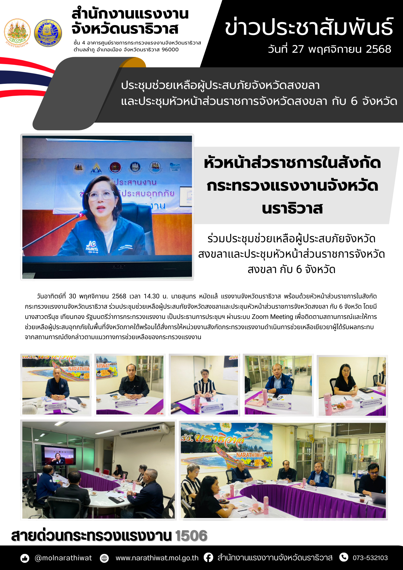 วันอาทิตย์ที่ 30 พฤศจิกายน 2568 เวลา 14.30 น. นายสุนทร หมัดแล้ แรงงานจังหวัดนราธิวาส พร้อมด้วยหัวหน้าส่วนราชการในสังกัดกระทรวงแรงงานจังหวัดนราธิวาส ร่วมประชุมช่วยเหลือผู้ประสบภัยจังหวัดสงขลาและประชุมหัวหน้าส่วนราชการจังหวัดสงขลา กับ 6 จังหวัด โดยมี นางสาวตรีนุช เทียนทอง รัฐมนตรีว่าการกระทรวงแรงงาน เป็นประธานการประชุมฯ ผ่านระบบ Zoom Meeting เพื่อติดตามสถานการณ์และให้การช่วยเหลือผู้ประสบอุทกภัยในพื้นที่จังหวัดภาคใต้พร้อมได้สั่งการให้หน่วยงานสังกัดกระทรวงแรงงานดำเนินการช่วยเหลือเยียวยาผู้ได้รับผลกระทบจากสถานการณ์ดังกล่าวตามแนวทางการช่วยเหลือของกระทรวงแรงงาน