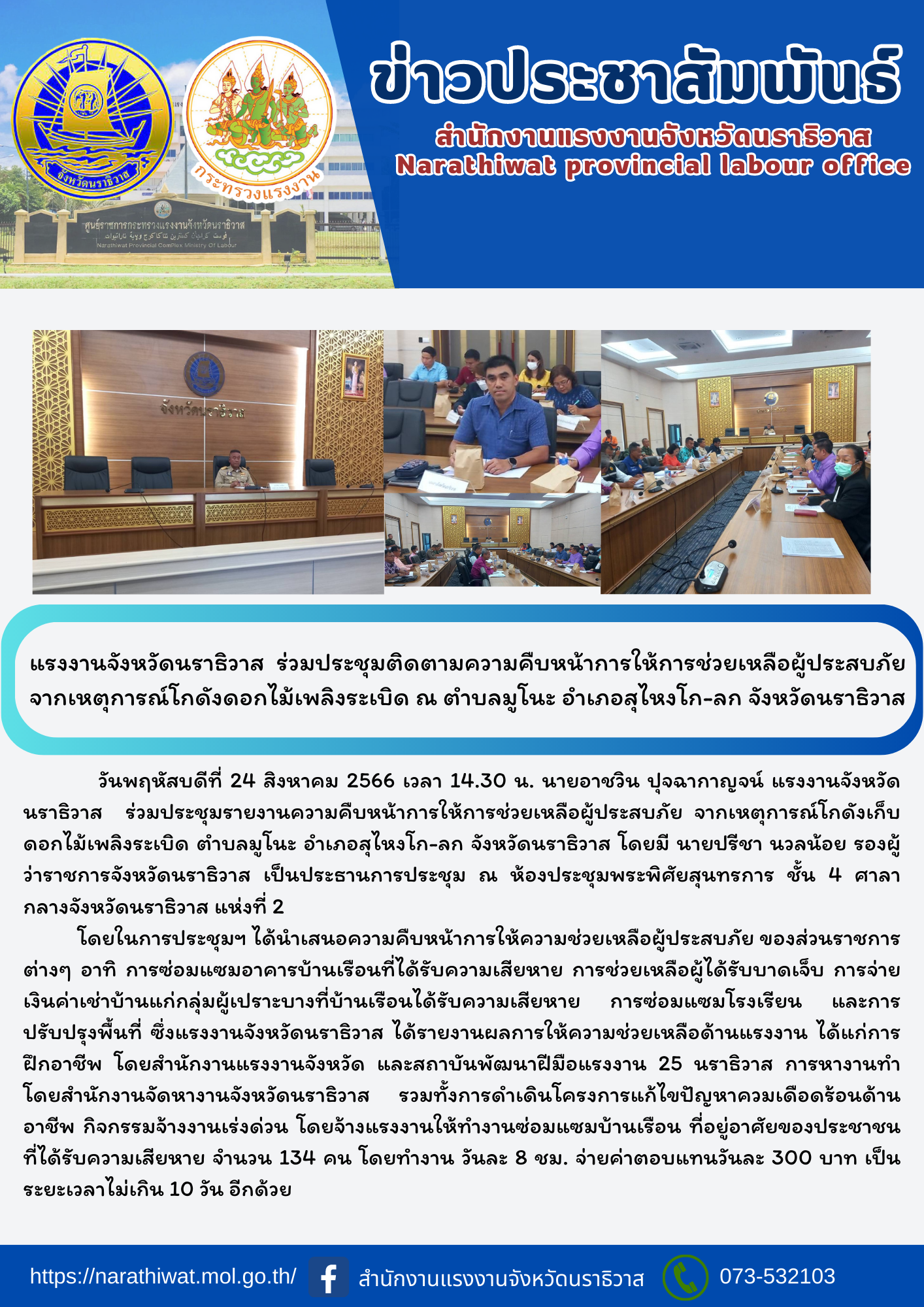 วันพฤหัสบดีที่ 24 สิงหาคม 2566 เวลา 14.30 น. นายอาชวิน ปุจฉากาญจน์ แรงงานจังหวัดนราธิวาส ร่วมประชุมรายงานความคืบหน้าการให้การช่วยเหลือผู้ประสบภัย จากเหตุการณ์โกดังเก็บดอกไม้เพลิงระเบิด ตำบลมูโนะ อำเภอสุไหงโก-ลก จังหวัดนราธิวาส โดยมี นายปรีชา นวลน้อย รองผู้ว่าราชการจังหวัดนราธิวาส เป็นประธานการประชุม ณ ห้องประชุมพระพิศัยสุนทรการ ชั้น 4 ศาลากลางจังหวัดนราธิวาส แห่งที่ 2 โดยในการประชุมฯ ได้นำเสนอความคืบหน้าการให้ความช่วยเหลือผู้ประสบภัย ของส่วนราชการต่างๆ อาทิ การซ่อมแซมอาคารบ้านเรือนที่ได้รับความเสียหาย การช่วยเหลือผู้ได้รับบาดเจ็บ การจ่ายเงินค่าเช่าบ้านแก่กลุ่มผู้เปราะบางที่บ้านเรือนได้รับความเสียหาย การซ่อมแซมโรงเรียน และการปรับปรุงพื้นที่ ซึ่งแรงงานจังหวัดนราธิวาส ได้รายงานผลการให้ความช่วยเหลือด้านแรงงาน ได้แก่การฝึกอาชีพ โดยสำนักงานแรงงานจังหวัด และสถาบันพัฒนาฝีมือแรงงาน 25 นราธิวาส การหางานทำ โดยสำนักงานจัดหางานจังหวัดนราธิวาส รวมทั้งการดำเดินโครงการแก้ไขปัญหาควมเดือดร้อนด้านอาชีพ กิจกรรมจ้างงานเร่งด่วน โดยจ้างแรงงานให้ทำงานซ่อมแซมบ้านเรือน ที่อยู่อาศัยของประชาชนที่ได้รับความเสียหาย จำนวน 134 คน โดยทำงาน วันละ 8 ชม. จ่ายค่าตอบแทนวันละ 300 บาท เป็นระยะเวลาไม่เกิน 10 วัน อีกด้วย