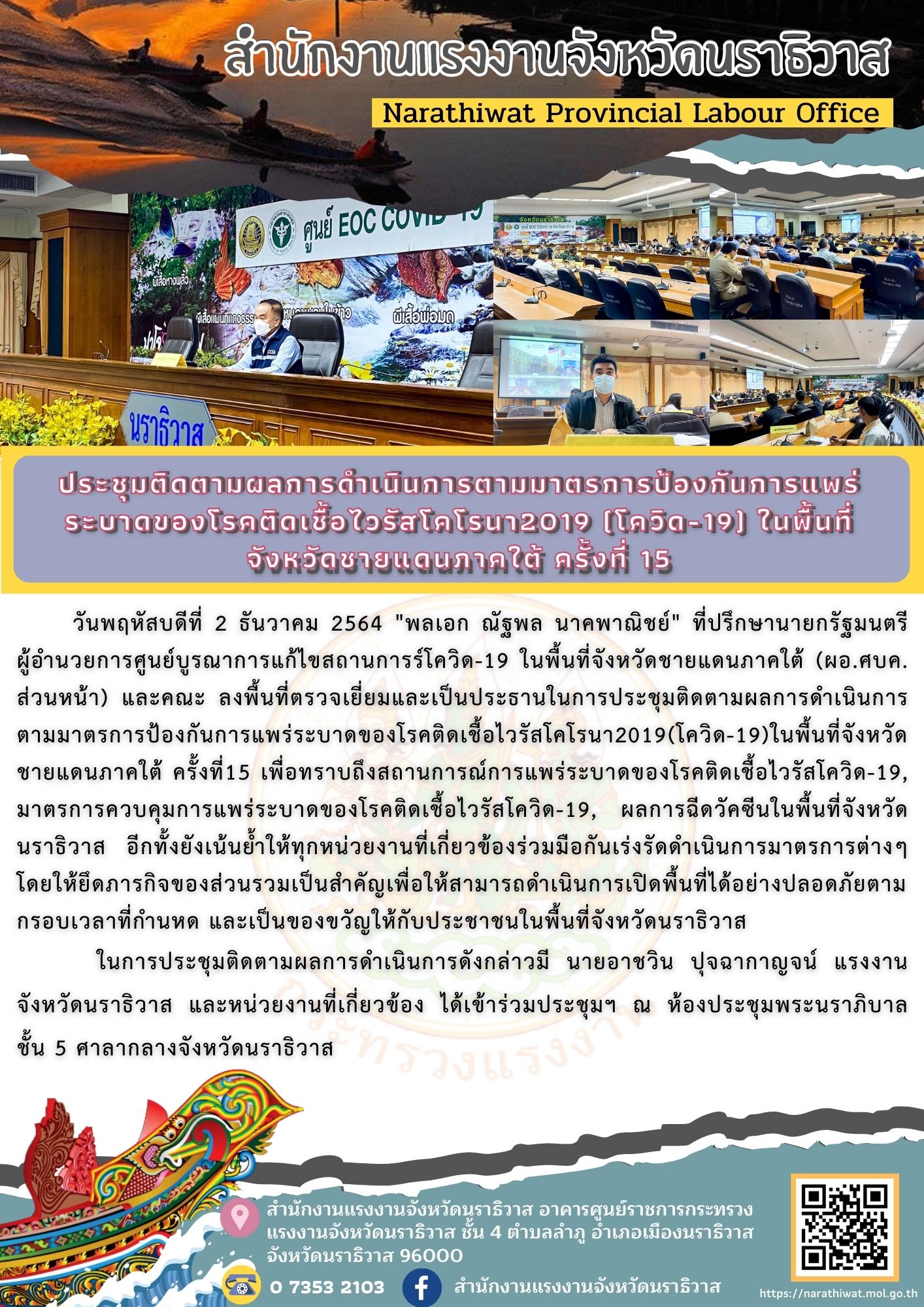 วันพฤหัสบดีที่ 2 ธันวาคม 2564 “พลเอก ณัฐพล นาคพาณิชย์” ที่ปรึกษานายกรัฐมนตรี ผู้อำนวยการศูนย์บูรณาการแก้ไขสถานการร์โควิด-19 ในพื้นที่จังหวัดชายแดนภาคใต้ (ผอ.ศบค. ส่วนหน้า) และคณะ ลงพื้นที่ตรวจเยี่ยมและเป็นประธานในการประชุมติดตามผลการดำเนินการตามมาตรการป้องกันการแพร่ระบาดของโรคติดเชื้อไวรัสโคโรนา2019(โควิด-19)ในพื้นที่จังหวัดชายแดนภาคใต้ ครั้งที่15 เพื่อทราบถึงสถานการณ์การแพร่ระบาดของโรคติดเชื้อไวรัสโควิด-19, มาตรการควบคุมการแพร่ระบาดของโรคติดเชื้อไวรัสโควิด-19, ผลการฉีดวัคซีนในพื้นที่จังหวัดนราธิวาส อีกทั้งยังเน้นย้ำให้ทุกหน่วยงานที่เกี่ยวข้องร่วมมือกันเร่งรัดดำเนินการมาตรการต่างๆ โดยให้ยึดภารกิจของส่วนรวมเป็นสำคัญเพื่อให้สามารถดำเนินการเปิดพื้นที่ได้อย่างปลอดภัยตามกรอบเวลาที่กำนหด และเป็นของขวัญให้กับประชาชนในพื้นที่จังหวัดนราธิวาส