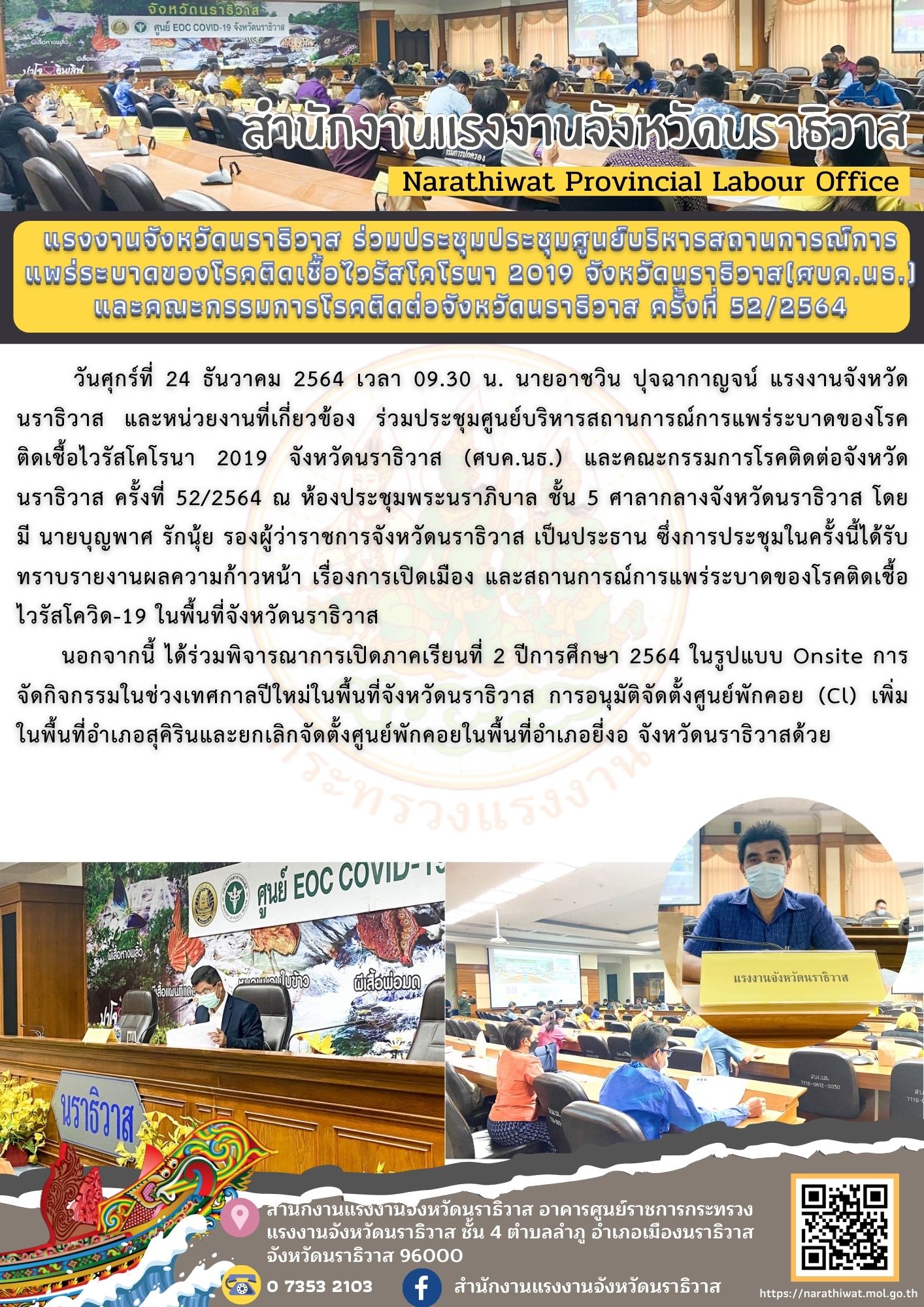 วันศุกร์ที่ 24 ธันวาคม 2564 เวลา 09.30 น. นายอาชวิน ปุจฉากาญจน์ แรงงานจังหวัดนราธิวาส และหน่วยงานที่เกี่ยวข้อง ร่วมประชุมศูนย์บริหารสถานการณ์การแพร่ระบาดของโรคติดเชื้อไวรัสโคโรนา 2019 จังหวัดนราธิวาส (ศบค.นธ.) และคณะกรรมการโรคติดต่อจังหวัดนราธิวาส ครั้งที่ 52/2564 ณ ห้องประชุมพระนราภิบาล ชั้น 5 ศาลากลางจังหวัดนราธิวาส โดยมี นายบุญพาศ รักนุ้ย รองผู้ว่าราชการจังหวัดนราธิวาส เป็นประธาน ซึ่งการประชุมในครั้งนี้ได้รับทราบรายงานผลความก้าวหน้า เรื่องการเปิดเมือง และสถานการณ์การแพร่ระบาดของโรคติดเชื้อไวรัสโควิด-19 ในพื้นที่จังหวัดนราธิวาส