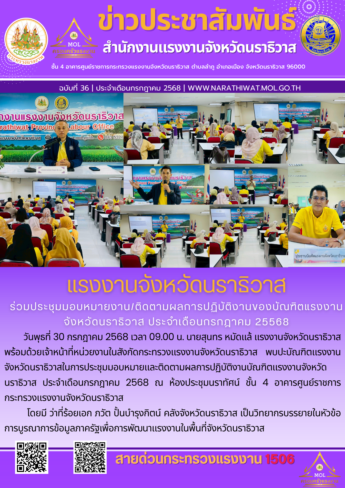 วันพุธที่ 30 กรกฎาคม 2568 เวลา 09.00 น. นายสุนทร หมัดแล้ แรงงานจังหวัดนราธิวาส พร้อมด้วยเจ้าหน้าที่หน่วยงานในสังกัดกระทรวงแรงงานจังหวัดนราธิวาส พบปะบัณฑิตแรงงานจังหวัดนราธิวาสในการประชุมมอบหมายและติดตามผลการปฏิบัติงานบัณฑิตแรงงานจังหวัดนราธิวาส ประจำเดือนกรกฎาคม 2568 ณ ห้องประชุมนราทัศน์ ชั้น 4 อาคารศูนย์ราชการกระทรวงแรงงานจังหวัดนราธิวาส โดยมี ว่าที่ร้อยเอก ภวัต ปั้นบำรุงกิตน์ คลังจังหวัดนราธิวาส เป็นวิทยากรบรรยายในหัวข้อ การบูรณาการข้อมูลภาครัฐเพื่อการพัฒนาแรงงานในพื้นที่จังหวัดนราธิวาส