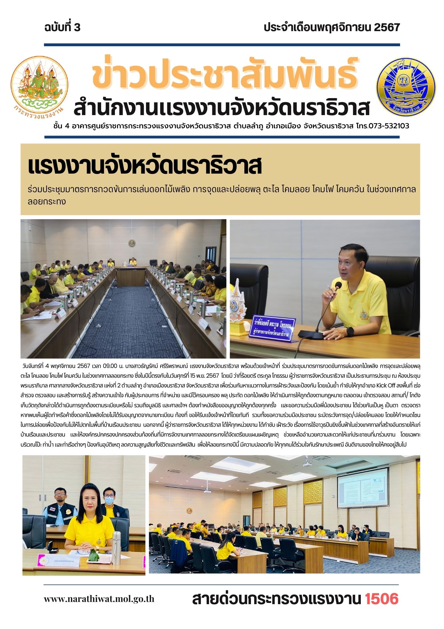 วันจันทร์ที่ 4 พฤศจิกายน 2567 เวลา 09.00 น. นางสาวธัญรัศม์ ศรีริพราหมณ์ แรงงานจังหวัดนราธิวาส พร้อมด้วยเจ้าหน้าที่ ร่วมประชุมมาตรการกวดขันการเล่นดอกไม้เพลิง การจุดและปล่อยพลุ ตะไล โคมลอย โคมไฟ โคมควัน ในช่วงเทศกาลลอยกระทง ซี่งในปีนี้ตรงกับในวันศุกร์ที่ 15 พ.ย. 2567 โดยมี ว่าที่ร้อยตรี ตระกูล โทธรรม ผู้ว่าราชการจังหวัดนราธิวาส เป็นประธานการประชุม ณ ห้องประชุมพระนราภิบาล ศาลากลางจังหวัดนราธิวาส แห่งที่ 2 ตำบลลำภู อำเภอเมืองนราธิวาส จังหวัดนราธิวาส เพื่อร่วมกันหาแนวทางในการเฝ้าระวังและป้องกัน โดยเน้นย้ำ กำชับให้ทุกอำเภอ Kick Off ลงพื้นที่ เร่งสำรวจ ตรวจสอบ และสร้างการรับรู้ สร้างความเข้าใจ กับผู้ประกอบการ ที่จำหน่าย และมีไว้ครอบครอง พลุ ประทัด ดอกไม้เพลิง ให้ดำเนินการให้ถูกต้องตามกฎหมาย ตลอดจน เข้าตรวจสอบ สถานที่/ โกดังเก็บวัตถุดังกล่าวได้ดำเนินการถูกต้องตามระเบียบหรือไม่ รวมถึงมูลนิธิ และศาลเจ้าฯ ต้องทำหนังสือขออนุญาตให้ถูกต้องทุกครั้ง และขอความร่วมมือพี่น้องประชาชน ได้ช่วยกันเป็นหู เป็นตา ตรวจตรา หากพบเห็นผู้ใดทำหรือค้าซึ่งดอกไม้เพลิงโดยไม่ได้รับอนุญาตจากนายทะเบียน ท้องที่ ขอให้รีบแจ้งเจ้าหน้าที่โดยทันที รวมทั้งขอความร่วมมือประชาชน ระมัดระวังการจุด/ปล่อยโคมลอย โดยให้กำหนดโซนในการปล่อยเพื่อป้องกันไม่ให้ไปตกในพื้นที่บ้านเรือนประชาชน นอกจากนี้ ผู้ว่าราชการจังหวัดนราธิวาส ได้ให้ทุกหน่วยงาน ได้กำชับ เฝ้าระวัง เรื่องการใช้อาวุธปืนยิงขึ้นฟ้าในช่วงเทศกาลที่สร้างอันตรายให้แก่บ้านเรือนและประชาชน และให้องค์กรปกครองปกครองส่วนท้องถิ่นที่มีการจัดงานเทศกาลลอยกระทงได้จัดเตรียมแผนเผชิญเหตุ ช่วยเหลืออำนวยความสะดวกให้แก่ประชาชนที่มาร่วมงาน โดยเฉพาะ บริเวณโป๊ะ ท่าน้ำ และท่าเรือต่างๆ ป้องกันอุบัติเหตุ ลดความสูญเสียทั้งชีวิตและทรัพย์สิน เพื่อให้ลอยกระทงปีนี้ มีความปลอดภัย ให้ทุกคนได้ร่วมใจกันรักษาประเพณี อันดีงามของไทยให้คงอยู่สืบไป