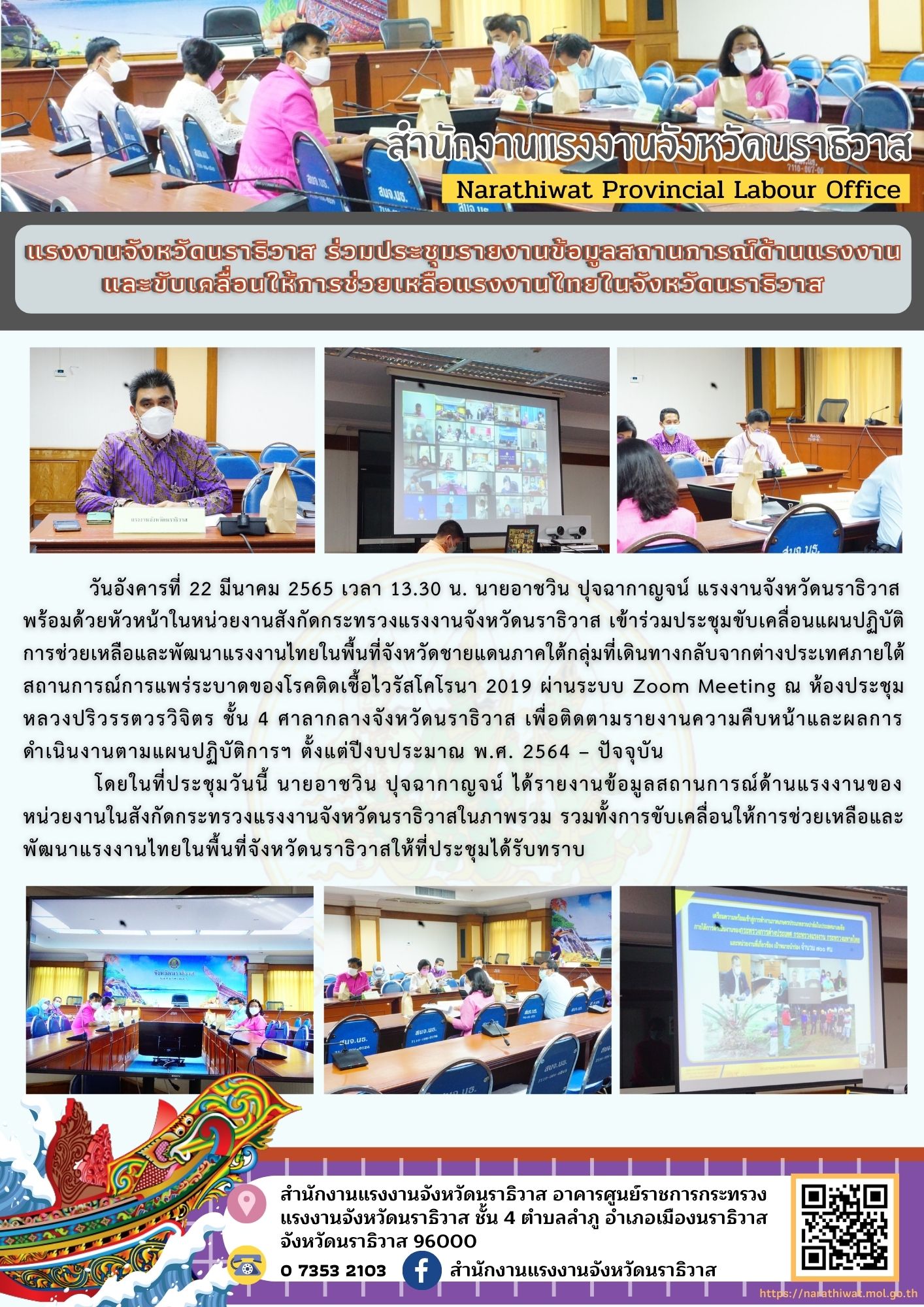 วันอังคารที่ 22 มีนาคม 2565 เวลา 13.30 น. นายอาชวิน ปุจฉากาญจน์ แรงงานจังหวัดนราธิวาส พร้อมด้วยหัวหน้าในหน่วยงานสังกัดกระทรวงแรงงานจังหวัดนราธิวาส เข้าร่วมประชุมขับเคลื่อนแผนปฏิบัติการช่วยเหลือและพัฒนาแรงงานไทยในพื้นที่จังหวัดชายแดนภาคใต้กลุ่มที่เดินทางกลับจากต่างประเทศภายใต้สถานการณ์การแพร่ระบาดของโรคติดเชื้อไวรัสโคโรนา 2019 ผ่านระบบ Zoom Meeting ณ ห้องประชุมหลวงปริวรรตวรวิจิตร ชั้น 4 ศาลากลางจังหวัดนราธิวาส เพื่อติดตามรายงานความคืบหน้าและผลการดำเนินงานตามแผนปฏิบัติการฯ ตั้งแต่ปีงบประมาณ พ.ศ. 2564 – ปัจจุบัน