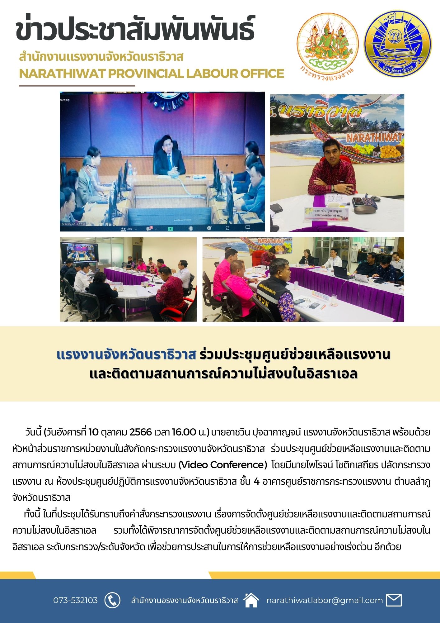 วันนี้ (วันอังคารที่ 10 ตุลาคม 2566 เวลา 16.00 น.) นายอาชวิน ปุจฉากาญจน์ แรงงานจังหวัดนราธิวาส พร้อมด้วยหัวหน้าส่วนราชการหน่วยงานในสังกัดกระทรวงแรงงานจังหวัดนราธิวาส ร่วมประชุมศูนย์ช่วยเหลือแรงงานและติดตามสถานการณ์ความไม่สงบในอิสราเอล ผ่านระบบ (Video Conference) โดยมีนายไพโรจน์ โชติกเสถียร ปลัดกระทรวงแรงงาน ณ ห้องประชุมศูนย์ปฏิบัติการแรงงานจังหวัดนราธิวาส ชั้น 4 อาคารศูนย์ราชการกระทรวงแรงงาน ตำบลลำภู จังหวัดนราธิวาส