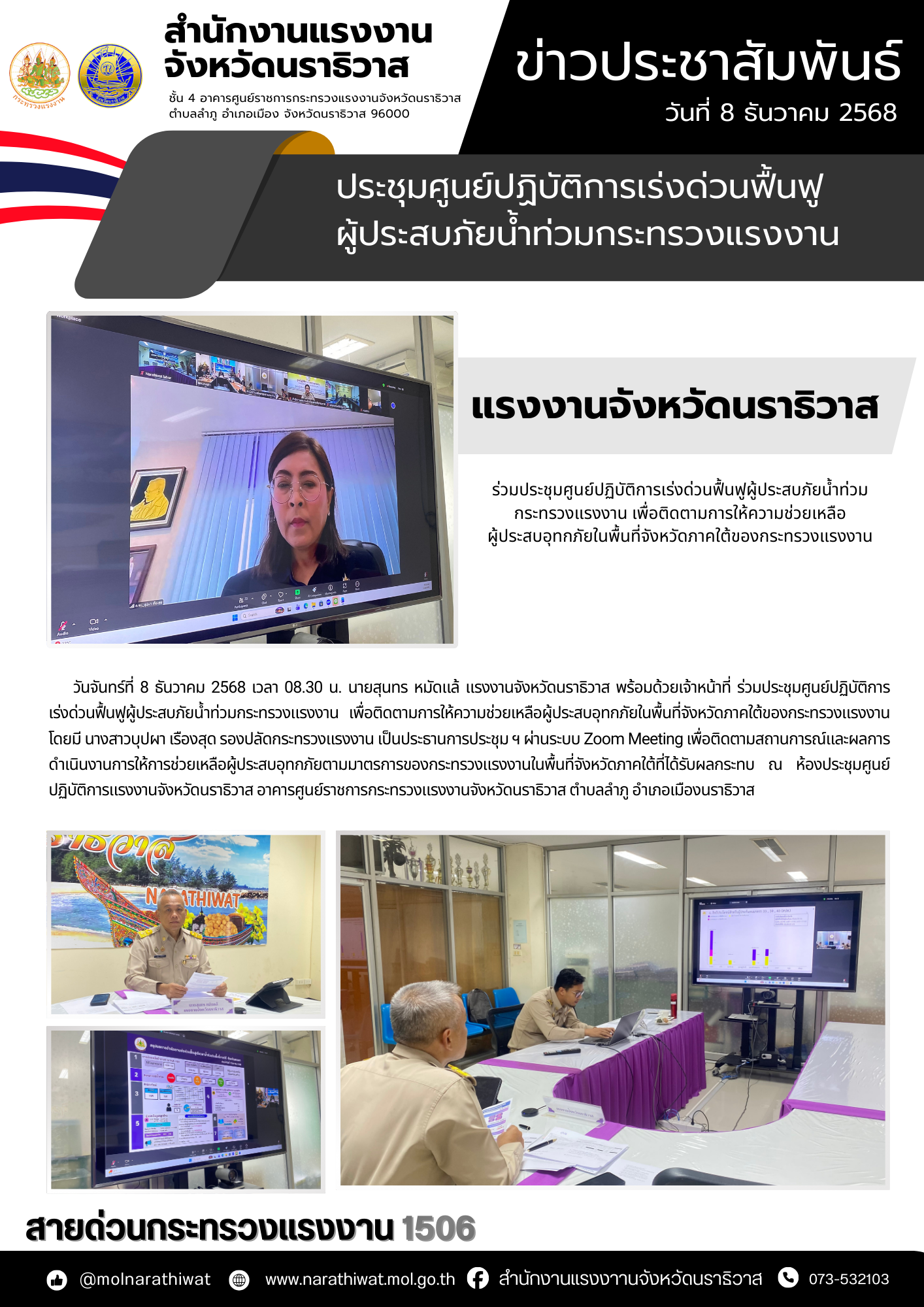 วันจันทร์ที่ 8 ธันวาคม 2568 เวลา 08.30 น. นายสุนทร หมัดแล้ แรงงานจังหวัดนราธิวาส พร้อมด้วยเจ้าหน้าที่ ร่วมประชุมศูนย์ปฏิบัติการ เร่งด่วนฟื้นฟูผู้ประสบภัยน้ำท่วมกระทรวงแรงงาน เพื่อติดตามการให้ความช่วยเหลือผู้ประสบอุทกภัยในพื้นที่จังหวัดภาคใต้ของกระทรวงแรงงาน โดยมี นางสาวบุปผา เรืองสุด รองปลัดกระทรวงแรงงาน เป็นประธานการประชุม ฯ ผ่านระบบ Zoom Meeting เพื่อติดตามสถานการณ์และผลการดำเนินงานการให้การช่วยเหลือผู้ประสบอุทกภัยตามมาตรการของกระทรวงแรงงานในพื้นที่จังหวัดภาคใต้ที่ได้รับผลกระทบ ณ ห้องประชุมศูนย์ปฏิบัติการแรงงานจังหวัดนราธิวาส อาคารศูนย์ราชการกระทรวงแรงงานจังหวัดนราธิวาส ตำบลลำภู อำเภอเมืองนราธิวาส
