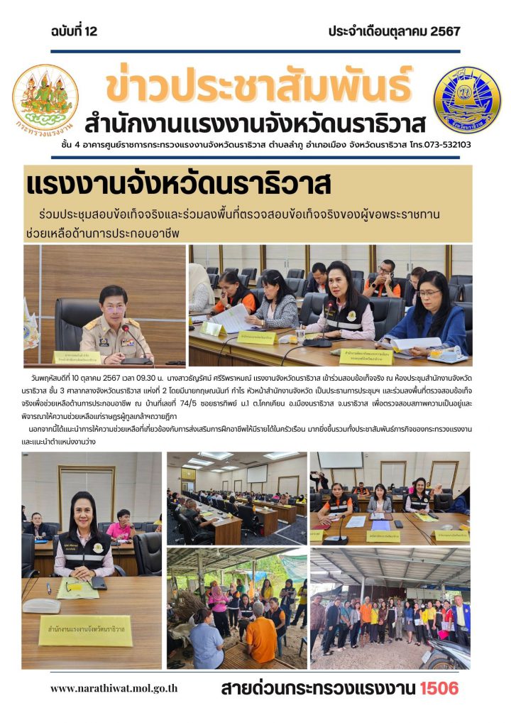 วันพฤหัสบดีที่ 10 ตุลาคม 2567 เวลา 09.30 น. นางสาวธัญรัศม์ ศรีริพราหมณ์ แรงงานจังหวัดนราธิวาส เข้าร่วมสอบข้อเท็จจริง ณ ห้องประชุมสำนักงานจังหวัดนราธิวาส ชั้น 3 ศาลากลางจังหวัดนราธิวาส แห่งที่ 2 โดยมีนายกฤษณนันท์ กำไร หัวหน้าสำนักงานจังหวัด เป็นประธานการประชุมฯ และร่วมลงพื้นที่ตรวจสอบข้อเท็จจริงเพื่อช่วยเหลือด้านการประกอบอาชีพ ณ บ้านที่เลขที่ 74/5 ซอยธารทิพย์ ม.1 ต.โคกเคียน อ.เมืองนราธิวาส จ.นราธิวาส เพื่อตรวจสอบสภาพความเป็นอยู่และพิจารณาให้ความช่วยเหลือแก่ราษฎรผู้ทูลเกล้าฯถวายฎีกา นอกจากนี้ได้แนะนำการให้ความช่วยเหลือที่เกี่ยวข้องกับการส่งเสริมการฝึกอาชีพให้มีรายได้ในครัวเรือน มากยิ่งขึ้นรวมทั้งประชาสัมพันธ์ภารกิจของกระทรวงแรงงาน และแนะนำตำแหน่งงานว่าง