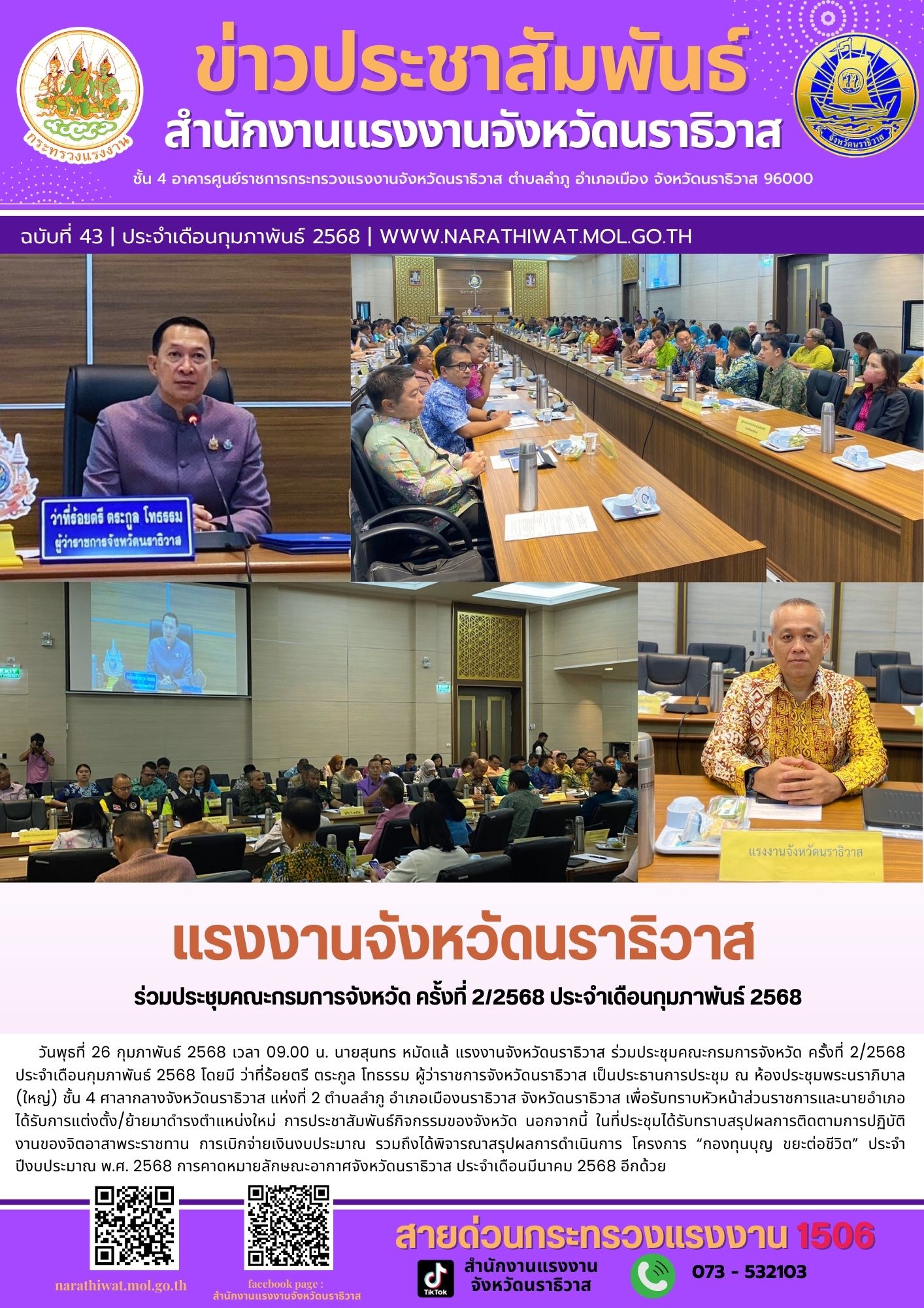 วันอังคารที่ 25 กุมภาพันธ์ 2568 เวลา 13.00 น. นายสุนทร หมัดแล้ แรงงานจังหวัดนราธิวาส ร่วมประชุมสำนักงานปลัดกระทรวงแรงงาน ครั้งที่ 1/2568 โดยมีนายบุญสงค์ ทัพชัยยุทธ์ ปลัดกระทรวงแรงงาน เป็นประธานการประชุม ฯ ผ่านระบบประชุมทางไกล (Zoom Meeting) ณ ห้องประชุมศูนย์ปฏิบัติการแรงงานจังหวัดนราธิวาส ชั้น 4 สำนักงานแรงงานจังหวัดนราธิวาส ตำบลลำภู อำเภอเมือง จังหวัดนราธิวาส เพื่อรับทราบการบริหาคบบุคลากรในสำนักงานปลัดกระทรวงปรงงาน ผลการดำเนินงานสำนักงานปลัดกระทรวงแรงงาน ประจำปีงบประมาณ พ.ศ. 2568 รอบ 4 เดือน (ต.ค. 2567 – ม.ค. 2568) ผลการใช้จ่ายงบประมาณของสำนักงานปลัดกระทรวงแรงงาน ประจำปีงบประมาณ พ.ศ. 2568 และการรับฟังแนวทางการดำเนินงานนโยบายกระทรวงแรงงาน ภายใต้แนวคิด MOL TRUST “ครอบครัวแรงงาน” ร่วมถึงข้อสั่งการของปลัดกระทรวงแรงงาน อีกด้วย