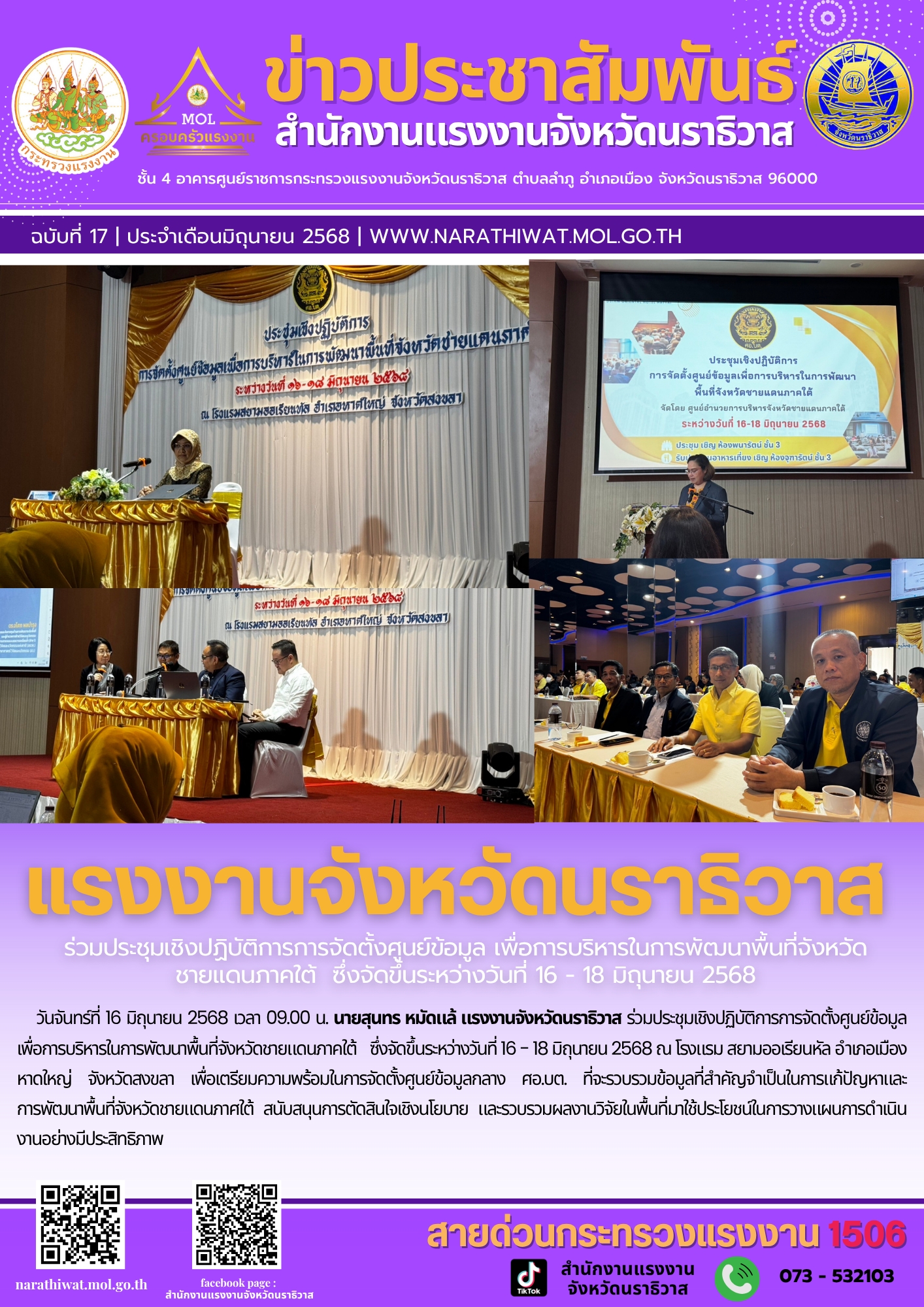 วันจันทร์ที่ 16 มิถุนายน 2568 เวลา 09.00 น. นายสุนทร หมัดแล้ แรงงานจังหวัดนราธิวาส ร่วมประชุมเชิงปฏิบัติการการจัดตั้งศูนย์ข้อมูล เพื่อการบริหารในการพัฒนาพื้นที่จังหวัดชายแดนภาคใต้ ซึ่งจัดขึ้นระหว่างวันที่ 16 – 18 มิถุนายน 2568 ณ โรงแรม สยามออเรียนหัล อำเภอเมืองหาดใหญ่ จังหวัดสงขลา เพื่อเตรียมความพร้อมในการจัดตั้งศูนย์ข้อมูลกลาง ศอ.บต. ที่จะรวบรวมข้อมูลที่สำคัญจำเป็นในการแก้ปัญหาและ การพัฒนาพื้นที่จังหวัดชายแดนภาศใต้ สนับสนุนการตัดสินใจเชิงนโยบาย และรวบรวมผลงานวิจัยในพื้นที่มาใช้ประโยชน์ในการวางแผนการดำเนินงานอย่างมีประสิทธิภาพ