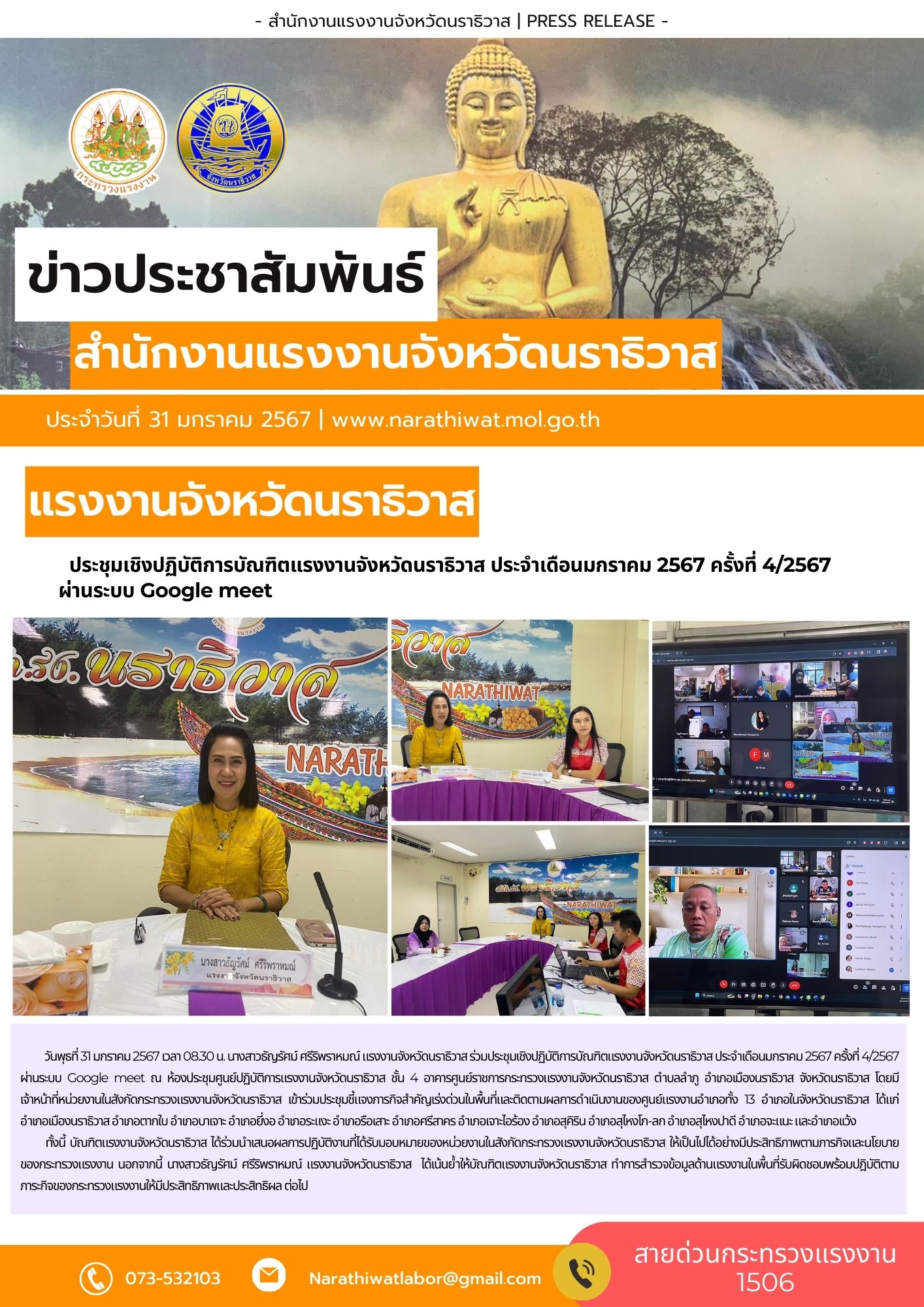 วันพุธที่ 31 มกราคม 2567 เวลา 08.30 น. นางสาวธัญรัศม์ ศรีริพราหมณ์ แรงงานจังหวัดนราธิวาส ร่วมประชุมเชิงปฏิบัติการบัณฑิตแรงงานจังหวัดนราธิวาส ประจำเดือนมกราคม 2567 ครั้งที่ 4/2567 ผ่านระบบ Google meet ณ ห้องประชุมศูนย์ปฏิบัติการแรงงานจังหวัดนราธิวาส ชั้น 4 อาคารศูนย์ราชการกระทรวงแรงงานจังหวัดนราธิวาส ตำบลลำภู อำเภอเมืองนราธิวาส จังหวัดนราธิวาส โดยมี เจ้าหน้าที่หน่วยงานในสังกัดกระทรวงแรงงานจังหวัดนราธิวาส เข้าร่วมประชุมชี้แจงภารกิจสำคัญเร่งด่วนในพื้นที่และติดตามผลการดำเนินงานของศูนย์แรงงานอำเภอทั้ง 13 อำเภอในจังหวัดนราธิวาส ได้แก่ อำเภอเมืองนราธิวาส อำเภอตากใบ อำเภอบาเจาะ อำเภอยี่งอ อำเภอระแงะ อำเภอรือเสาะ อำเภอศรีสาคร อำเภอเจาะไอร้อง อำเภอสุคิริน อำเภอสุไหงโก-ลก อำเภอสุไหงปาดี อำเภอจะแนะ และอำเภอเเว้ง ทั้งนี้ บัณฑิตแรงงานจังหวัดนราธิวาส ได้ร่วมนำเสนอผลการปฏิบัติงานที่ได้รับมอบหมายของหน่วยงานในสังกัดกระทรวงแรงงานจังหวัดนราธิวาส ให้เป็นไปได้อย่างมีประสิทธิภาพตามภารกิจและนโยบายของกระทรวงแรงงาน นอกจากนี้ นางสาวธัญรัศม์ ศรีริพราหมณ์ แรงงานจังหวัดนราธิวาส ได้เน้นย้ำให้บัณฑิตแรงงานจังหวัดนราธิวาส ทำการสำรวจข้อมูลด้านแรงงานในพื้นที่รับผิดชอบพร้อมปฎิบัติตามภาระกิจของกระทรวงแรงงานให้มีประสิทธิภาพและประสิทธิผล ต่อไป