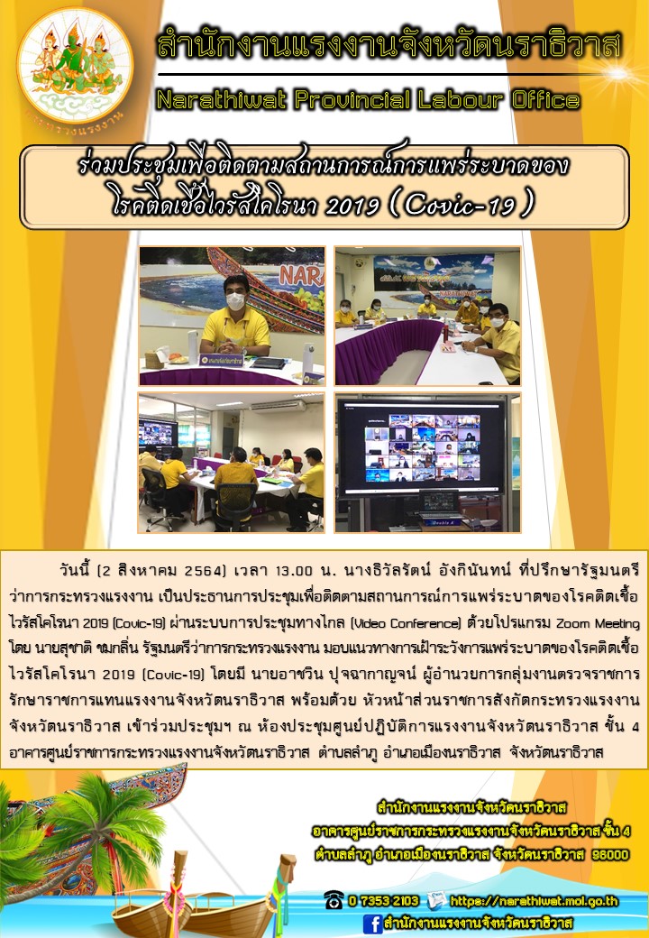 วันนี้ (2 สิงหาคม 2564) เวลา 13.00 น. นางธิวัลรัตน์ อังกินันทน์ ที่ปรึกษารัฐมนตรีว่าการกระทรวงแรงงาน เป็นประธานการประชุมเพื่อติดตามสถานการณ์การแพร่ระบาดของโรคติดเชื้อไวรัสโคโรนา 2019 (Covic-19) ผ่านระบบการประชุมทางไกล (Video Conference) ด้วยโปรแกรม Zoom Meeting โดย นายสุชาติ ชมกลิ่น รัฐมนตรีว่าการกระทรวงแรงงาน มอบแนวทางการเฝ้าระวังการแพร่ระบาดของโรคติดเชื้อไวรัสโคโรนา 2019 (Covic-19) โดยมี นายอาชวิน ปุจฉากาญจน์ ผู้อำนวยการกลุ่มงานตรวจราชการรักษาราชการแทนแรงงานจังหวัดนราธิวาส พร้อมด้วย หัวหน้าส่วนราชการสังกัดกระทรวงแรงงานจังหวัดนราธิวาส เข้าร่วมประชุมฯ ณ ห้องประชุมศูนย์ปฏิบัติการแรงงานจังหวัดนราธิวาส ชั้น 4 อาคารศูนย์ราชการกระทรวงแรงงานจังหวัดนราธิวาส ตำบลลำภู อำเภอเมืองนราธิวาส จังหวัดนราธิวาส