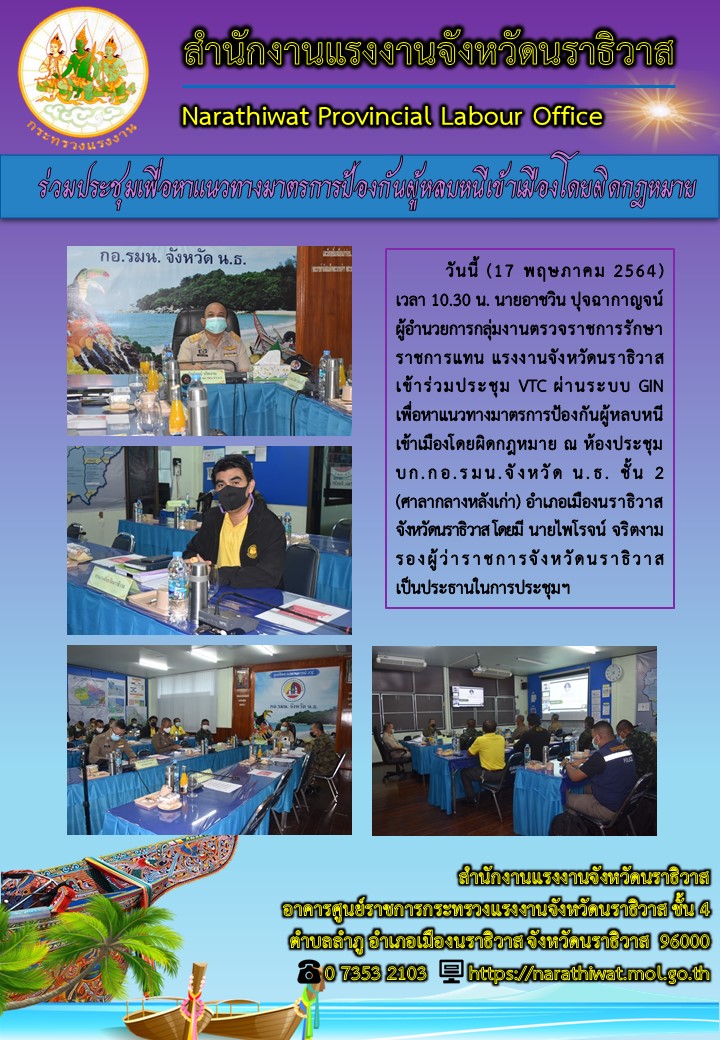วันนี้ (17 พฤษภาคม 2564)เวลา 10.30 น. นายอาชวิน ปุจฉากาญจน์ ผู้อำนวยการกลุ่มงานตรวจราชการรักษาราชการแทน แรงงานจังหวัดนราธิวาส เข้าร่วมประชุม VTC ผ่านระบบ GIN เพื่อหาแนวทางมาตรการป้องกันผู้หลบหนีเข้าเมืองโดยผิดกฎหมาย ณ ห้องประชุม บก.กอ.รมน.จังหวัด น.ธ. ชั้น 2 (ศาลากลางหลังเก่า) อำเภอเมืองนราธิวาส จังหวัดนราธิวาส โดยมี นายไพโรจน์ จริตงาม รองผู้ว่าราชการจังหวัดนราธิวาส เป็นประธานในการประชุมฯ