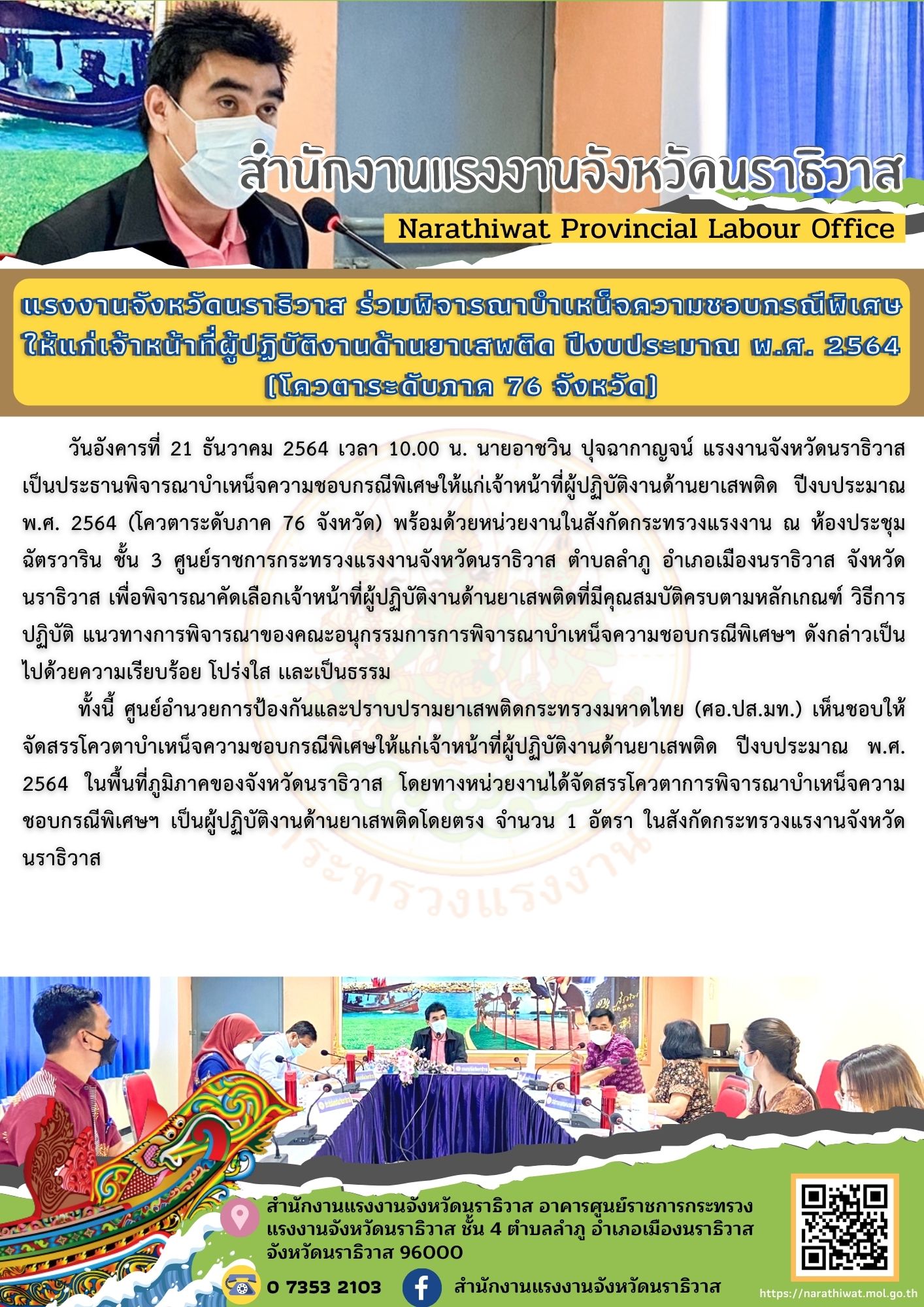 ทั้งนี้ ศูนย์อำนวยการป้องกันและปราบปรามยาเสพติดกระทรวงมหาดไทย (ศอ.ปส.มท.) เห็นชอบให้จัดสรรโควตาบำเหน็จความชอบกรณีพิเศษให้แก่เจ้าหน้าที่ผู้ปฏิบัติงานด้านยาเสพติด ปีงบประมาณ พ.ศ. 2564 ในพื้นที่ภูมิภาคของจังหวัดนราธิวาส โดยทางหน่วยงานได้จัดสรรโควตาการพิจารณาบำเหน็จความชอบกรณีพิเศษฯ เป็นผู้ปฏิบัติงานด้านยาเสพติดโดยตรง จำนวน 1 อัตรา ในสังกัดกระทรวงแรงานจังหวัดนราธิวาส