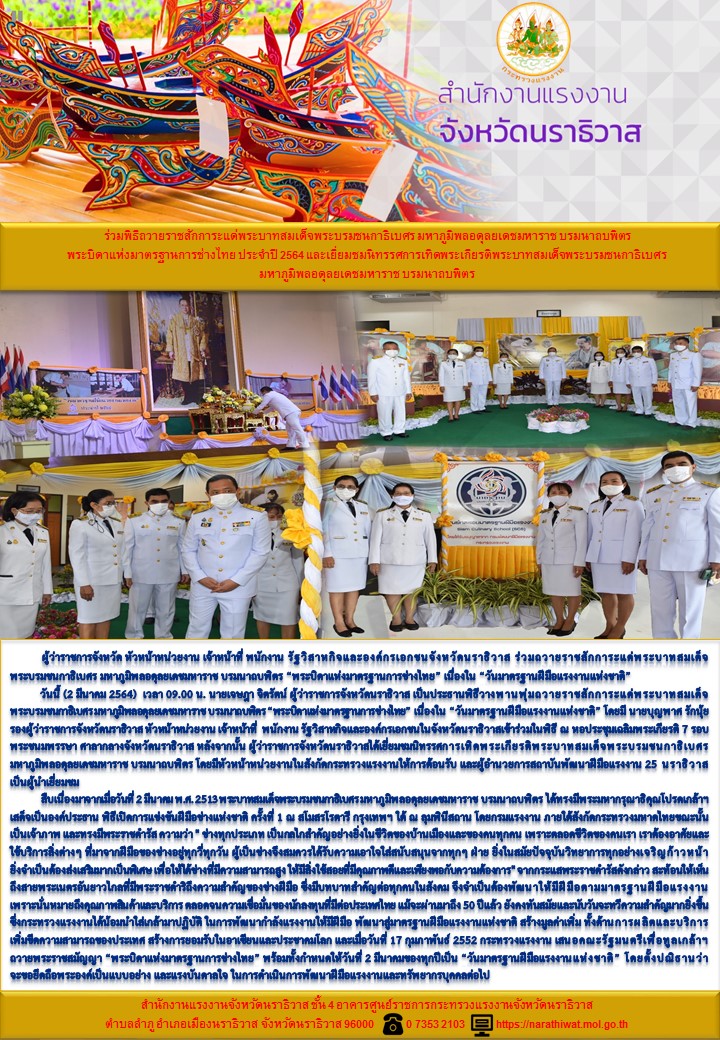 แรงงานจังหวัดนราธิวาส ร่วมพิธีถวายราชสักการะแด่พระบาทสมเด็จพระบรมชนกาธิเบศร มหาภูมิพลอดุลยเดชมหาราช บรมนาถบพิตร พระบิดาแห่งมาตรฐานการช่างไทย ประจำปี 2564 และเยี่ยมชมนิทรรศการเทิดพระเกียรติพระบาทสมเด็จพระบรมชนกาธิเบศรมหาภูมิพลอดุลยเดชมหาราช บรมนาถบพิตร