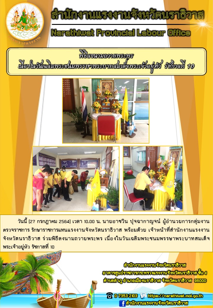 วันนี้ (27 กรกฏาคม 2564) เวลา 10.00 น. นายอาชวิน ปุจฉากาญจน์ ผู้อำนวยการกลุ่มงานตรวจราชการ รักษาราชการแทนแรงงานจังหวัดนราธิวาส พร้อมด้วย เจ้าหน้าที่สำนักงานแรงงานจังหวัดนราธิวาส ร่วมพิธีลงนามถวายพระพร เนื่องในวันเฉลิมพระชนมพรรษาพระบาทสมเด็จพระเจ้าอยู่หัว รัชกาลที่ 10