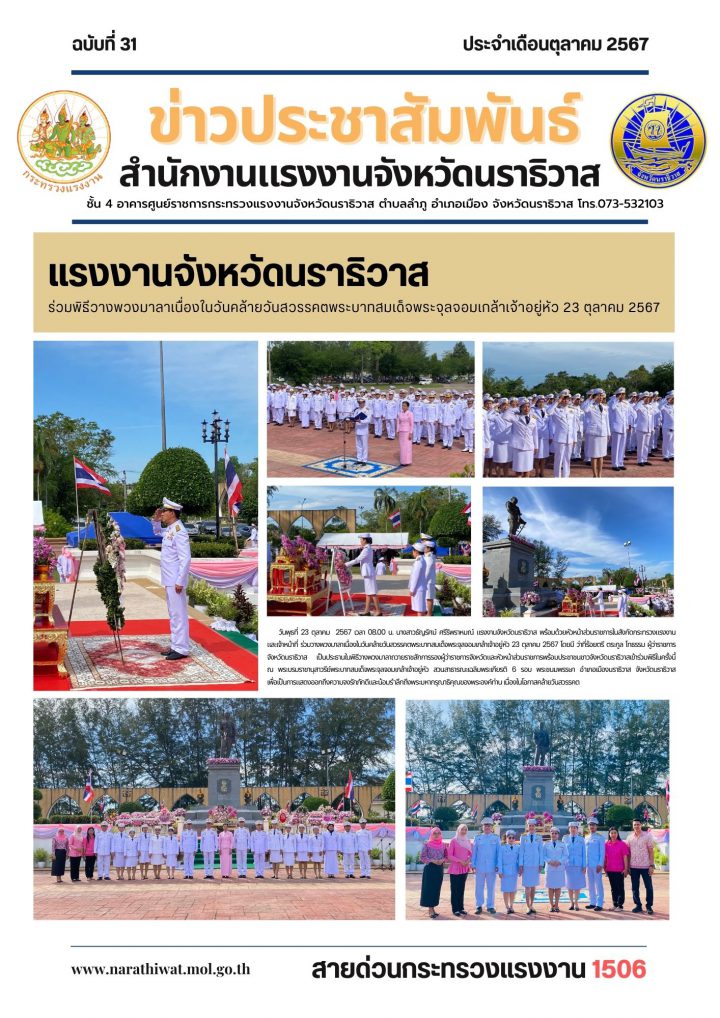 วันพุธที่ 23 ตุลาคม 2567 เวลา 08.00 น. นางสาวธัญรัศม์ ศรีริพราหมณ์ แรงงานจังหวัดนราธิวาส พร้อมด้วยหัวหน้าส่วนราชการในสังกัดกระทรวงแรงงาน และเจ้าหน้าที่ ร่วมวางพวงมาลาเนื่องในวันคล้ายวันสวรรคตพระบาทสมเด็จพระจุลจอมเกล้าเจ้าอยู่หัว 23 ตุลาคม 2567 โดยมี ว่าที่ร้อยตรี ตระกูล โทธรรม ผู้ว่าราชการจังหวัดนราธิวาส เป็นประธานในพิธีวางพวงมาลาถวายราชสักการรองผู้ว่าราชการจังหวัดและหัวหน้าส่วนราชการพร้อมประชาชนชาวจังหวัดนราธิวาสเข้าร่วมพิธีในครั้งนี้ ณ พระบรมราชานุสาวรีย์พระบาทสมเด็จพระจุลจอมเกล้าเจ้าอยู่หัว สวนสาธารณะเฉลิมพระเกียรติ 6 รอบ พระชนมพรรษา อำเภอเมืองนราธิวาส จังหวัดนราธิวาส เพื่อเป็นการแสดงออกถึงความจงรักภักดีและน้อมรำลึกถึงพระมหากรุณาธิคุณของพระองค์ท่าน เนื่องในโอกาสคล้ายวันสวรรคต