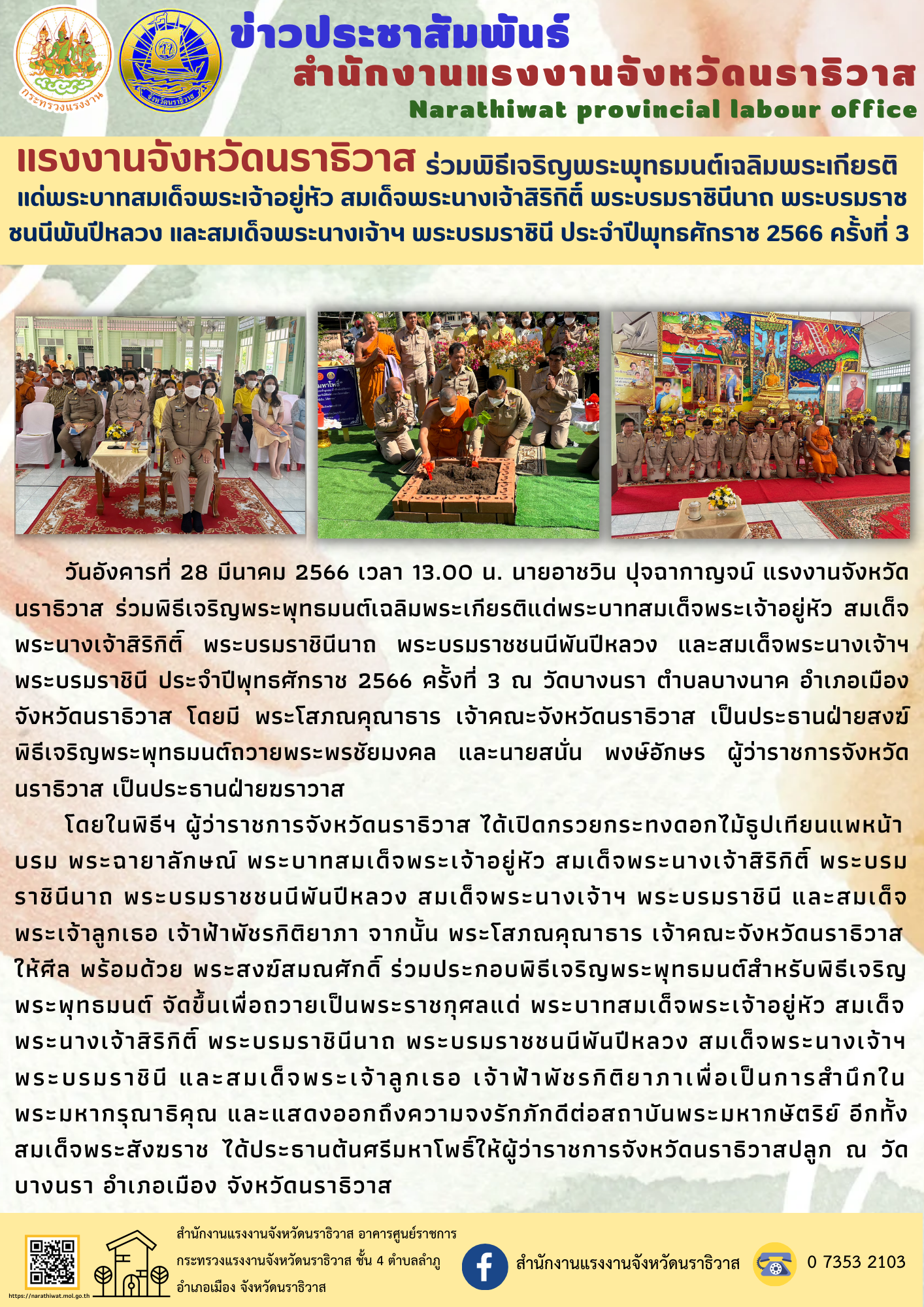 วันอังคารที่ 28 มีนาคม 2566 เวลา 13.00 น. นายอาชวิน ปุจฉากาญจน์ แรงงานจังหวัดนราธิวาส ร่วมพิธีเจริญพระพุทธมนต์เฉลิมพระเกียรติแด่พระบาทสมเด็จพระเจ้าอยู่หัว สมเด็จพระนางเจ้าสิริกิติ์ พระบรมราชินีนาถ พระบรมราชชนนีพันปีหลวง และสมเด็จพระนางเจ้าฯ พระบรมราชินี ประจำปีพุทธศักราช 2566 ครั้งที่ 3 ณ วัดบางนรา ตำบลบางนาค อำเภอเมือง จังหวัดนราธิวาส โดยมี พระโสภณคุณาธาร เจ้าคณะจังหวัดนราธิวาส เป็นประธานฝ่ายสงฆ์พิธีเจริญพระพุทธมนต์ถวายพระพรชัยมงคล และนายสนั่น พงษ์อักษร ผู้ว่าราชการจังหวัดนราธิวาส เป็นประธานฝ่ายฆราวาส โดยในพิธีฯ ผู้ว่าราชการจังหวัดนราธิวาส ได้เปิดกรวยกระทงดอกไม้ธูปเทียนแพหน้าบรม พระฉายาลักษณ์ พระบาทสมเด็จพระเจ้าอยู่หัว สมเด็จพระนางเจ้าสิริกิติ์ พระบรมราชินีนาถ พระบรมราชชนนีพันปีหลวง สมเด็จพระนางเจ้าฯ พระบรมราชินี และสมเด็จพระเจ้าลูกเธอ เจ้าฟ้าพัชรกิติยาภา จากนั้น พระโสภณคุณาธาร เจ้าคณะจังหวัดนราธิวาสให้ศีล พร้อมด้วย พระสงฆ์สมณศักดิ์ ร่วมประกอบพิธีเจริญพระพุทธมนต์สำหรับพิธีเจริญพระพุทธมนต์ จัดขึ้นเพื่อถวายเป็นพระราชกุศลแด่ พระบาทสมเด็จพระเจ้าอยู่หัว สมเด็จพระนางเจ้าสิริกิติ์ พระบรมราชินีนาถ พระบรมราชชนนีพันปีหลวง สมเด็จพระนางเจ้าฯ พระบรมราชินี และสมเด็จพระเจ้าลูกเธอ เจ้าฟ้าพัชรกิติยาภาเพื่อเป็นการสำนึกในพระมหากรุณาธิคุณ และแสดงออกถึงความจงรักภักดีต่อสถาบันพระมหากษัตริย์ อีกทั้งสมเด็จพระสังฆราช ได้ประธานต้นศรีมหาโพธิ์ให้ผู้ว่าราชการจังหวัดนราธิวาสปลูก ณ วัดบางนรา อำเภอเมือง จังหวัดนราธิวาส