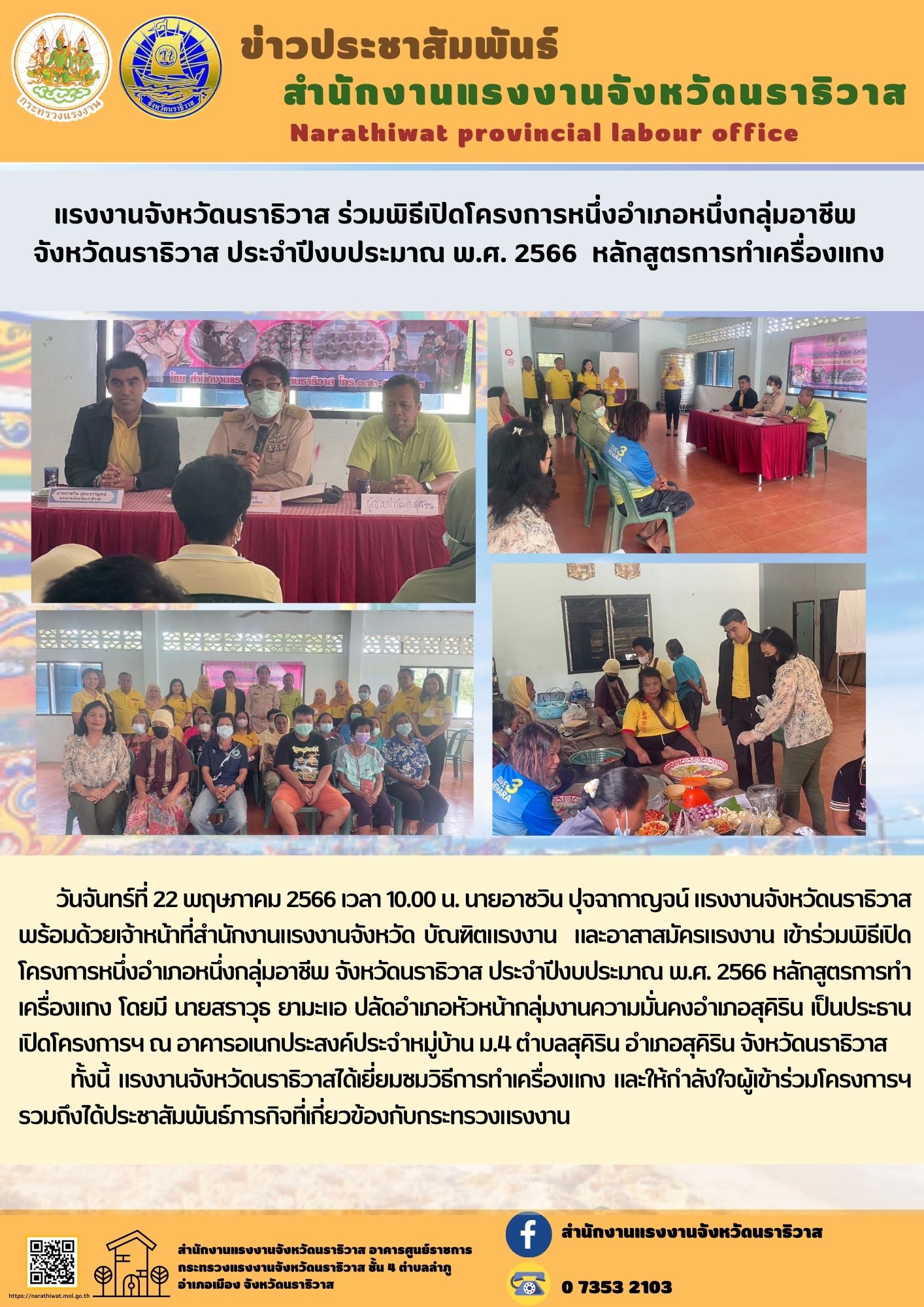วันจันทร์ที่ 22 พฤษภาคม 2566 เวลา 10.00 น. นายอาชวิน ปุจฉากาญจน์ แรงงานจังหวัดนราธิวาส พร้อมด้วยเจ้าหน้าที่สำนักงานแรงงานจังหวัด บัณฑิตแรงงาน และอาสาสมัครแรงงาน เข้าร่วมพิธีเปิดโครงการหนึ่งอำเภอหนึ่งกลุ่มอาชีพ จังหวัดนราธิวาส ประจำปีงบประมาณ พ.ศ. 2566 หลักสูตรการทำเครื่องแกง โดยมี นายสราวุธ ยามะแอ ปลัดอำเภอหัวหน้ากลุ่มงานความมั่นคงอำเภอสุคิริน เป็นประธานเปิดโครงการฯ ณ อาคารอเนกประสงค์ประจำหมู่บ้าน ม.4 ตำบลสุคิริน อำเภอสุคิริน จังหวัดนราธิวาส ทั้งนี้ แรงงานจังหวัดนราธิวาสได้เยี่ยมชมวิธีการทำเครื่องแกง และให้กำลังใจผู้เข้าร่วมโครงการฯ รวมถึงได้ประชาสัมพันธ์ภารกิจที่เกี่ยวข้องกับกระทรวงแรงงาน