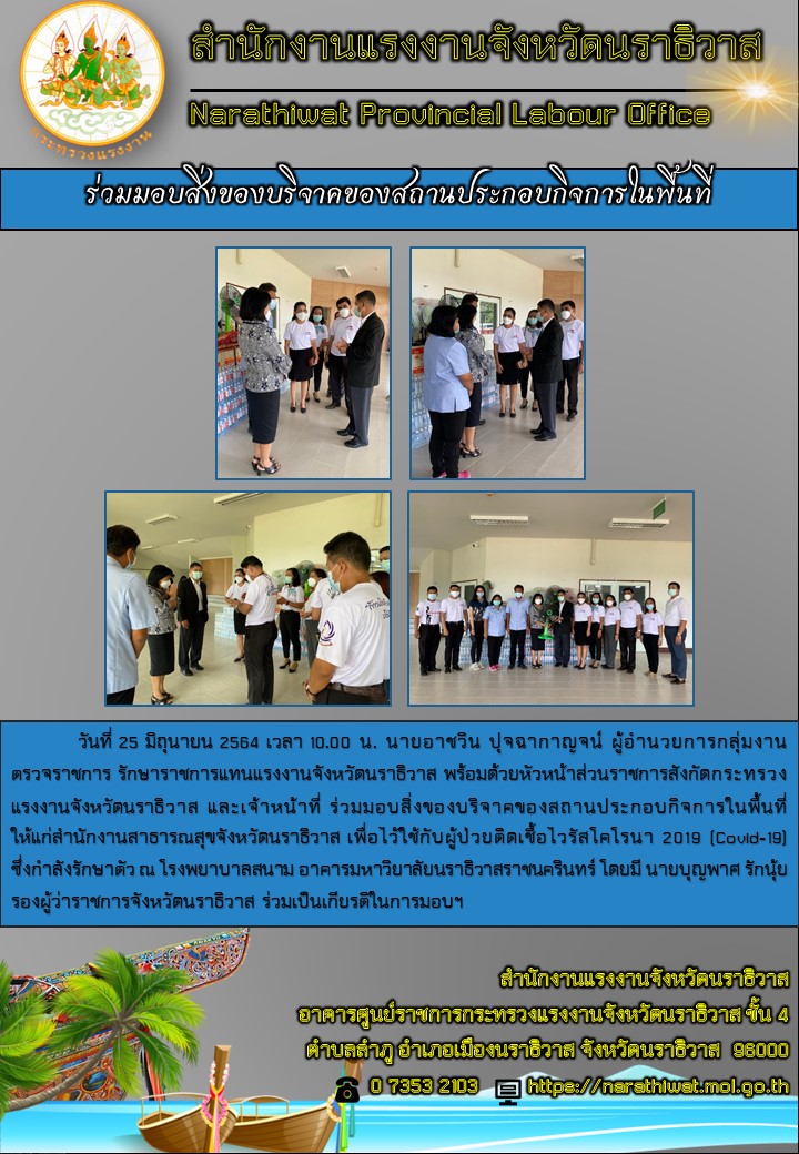 วันที่ 25 มิถุนายน 2564 เวลา 10.00 น. นายอาชวิน ปุจฉากาญจน์ ผู้อำนวยการกลุ่มงานตรวจราชการ รักษาราชการแทนแรงงานจังหวัดนราธิวาส พร้อมด้วยหัวหน้าส่วนราชการสังกัดกระทรวงแรงงานจังหวัดนราธิวาส และเจ้าหน้าที่ ร่วมมอบสิ่งของบริจาคของสถานประกอบกิจการในพื้นที่ ให้แก่สำนักงานสาธารณสุขจังหวัดนราธิวาส เพื่อไว้ใช้กับผู้ป่วยติดเชื้อไวรัสโคโรนา 2019 (Covid-19) ซึ่งกำลังรักษาตัว ณ โรงพยาบาลสนาม อาคารมหาวิยาลัยนราธิวาสราชนครินทร์ โดยมี นายบุญพาศ รักนุ้ย รองผู้ว่าราชการจังหวัดนราธิวาส ร่วมเป็นเกียรติในการมอบฯ